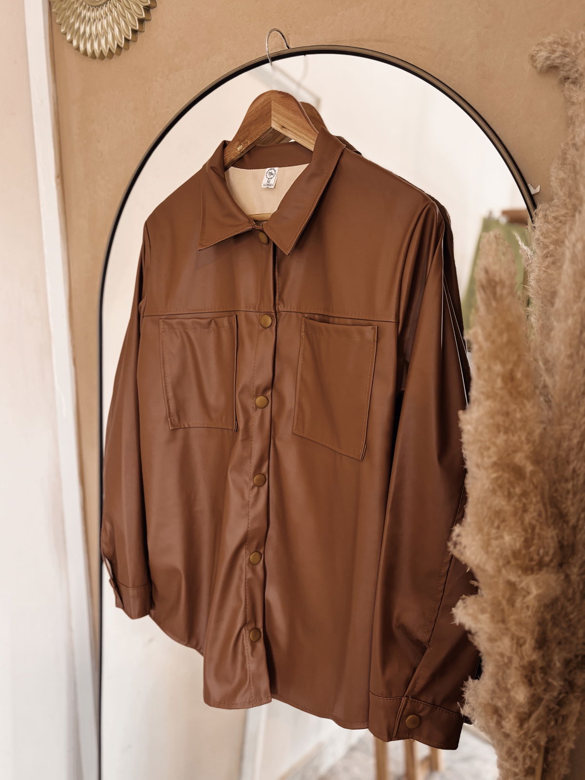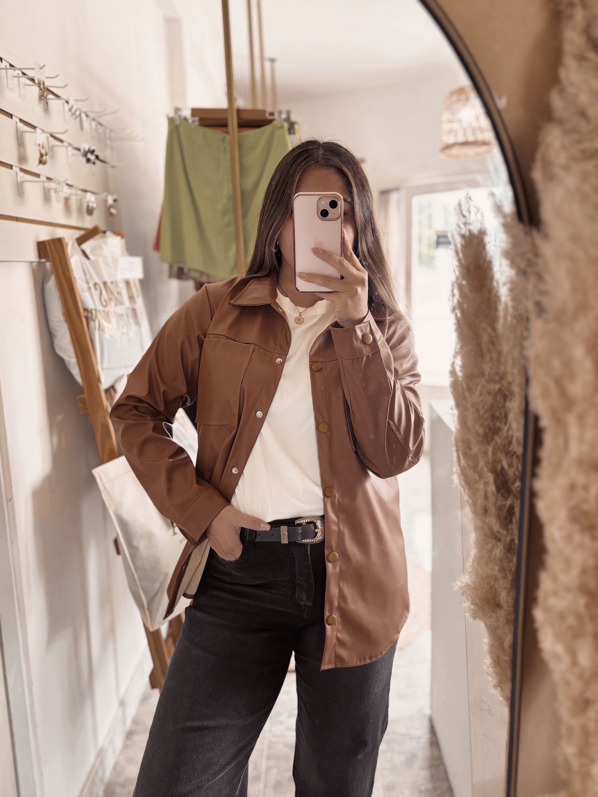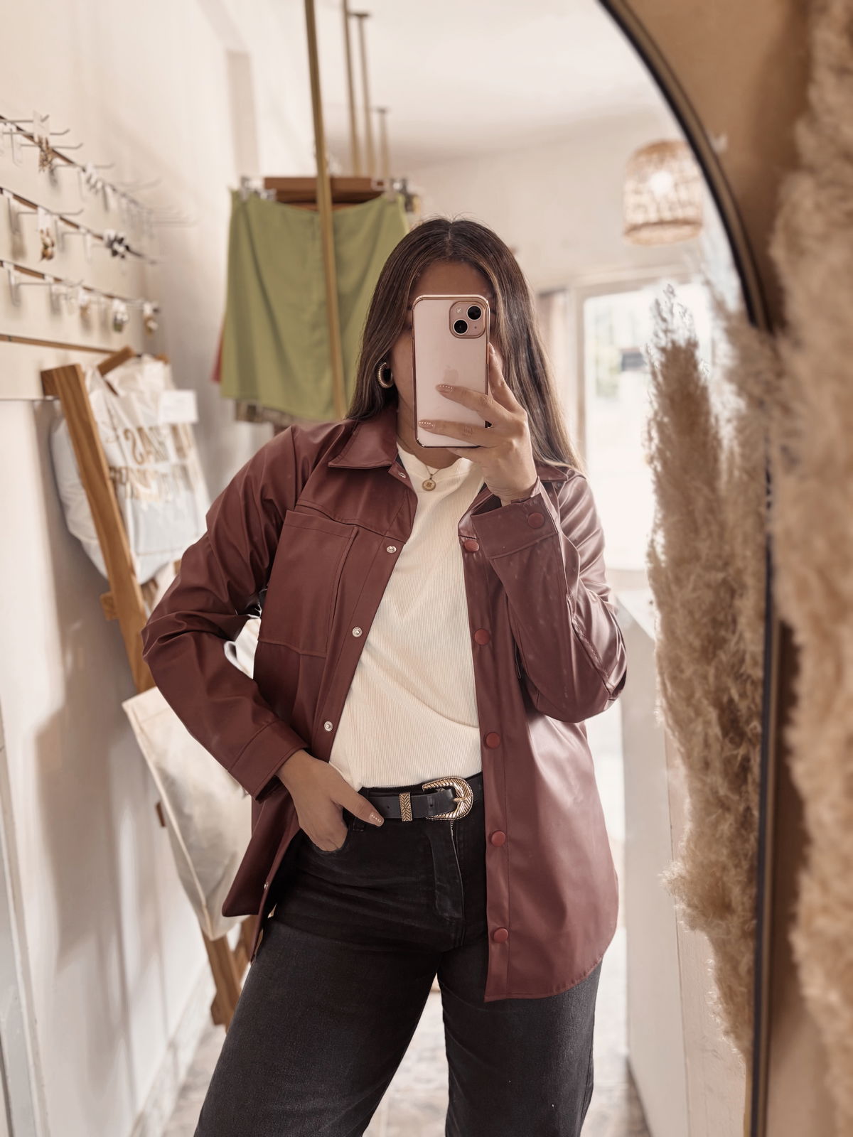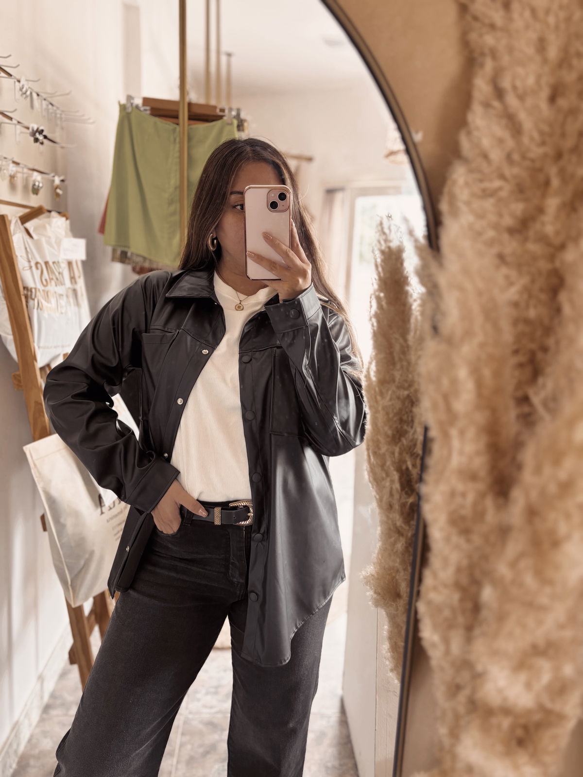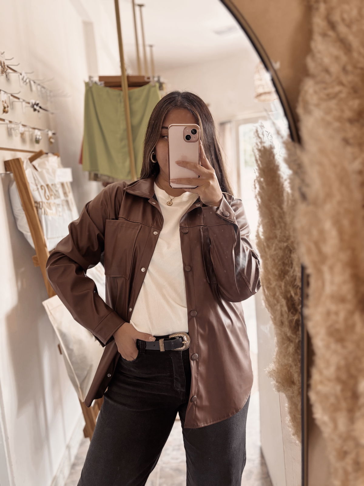Nuestro camisaco de eco-cuero combina estilo, comodidad y versatilidad. Ideal para usar abierto como sobrecamisa o cerrado como protagonista del look.