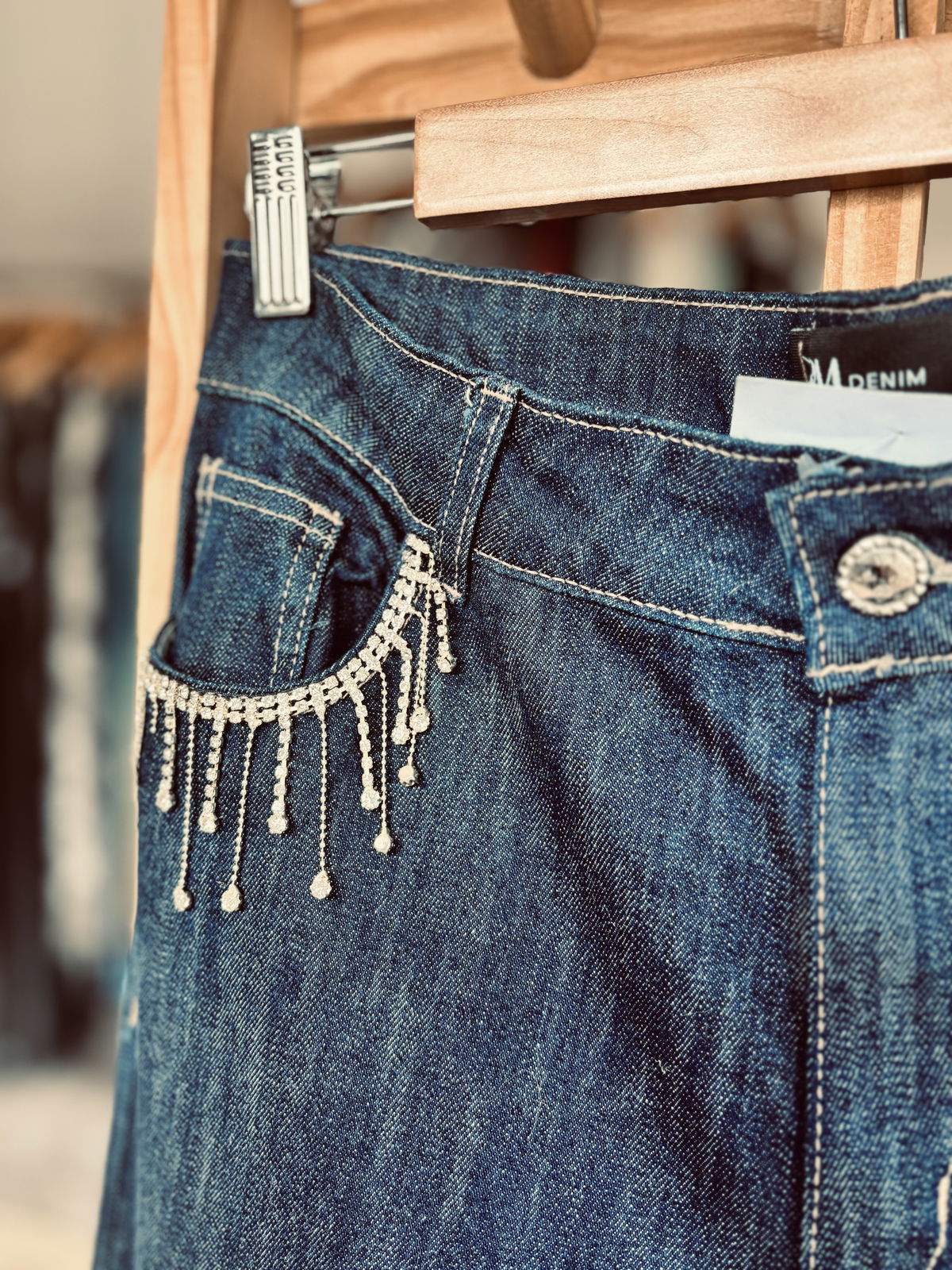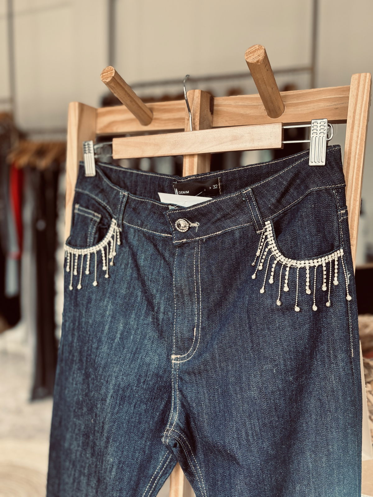 Lo que lo distingue: los bolsillos delanteros decorados con tiras de strass que aportan brillo y personalidad sin perder elegancia.