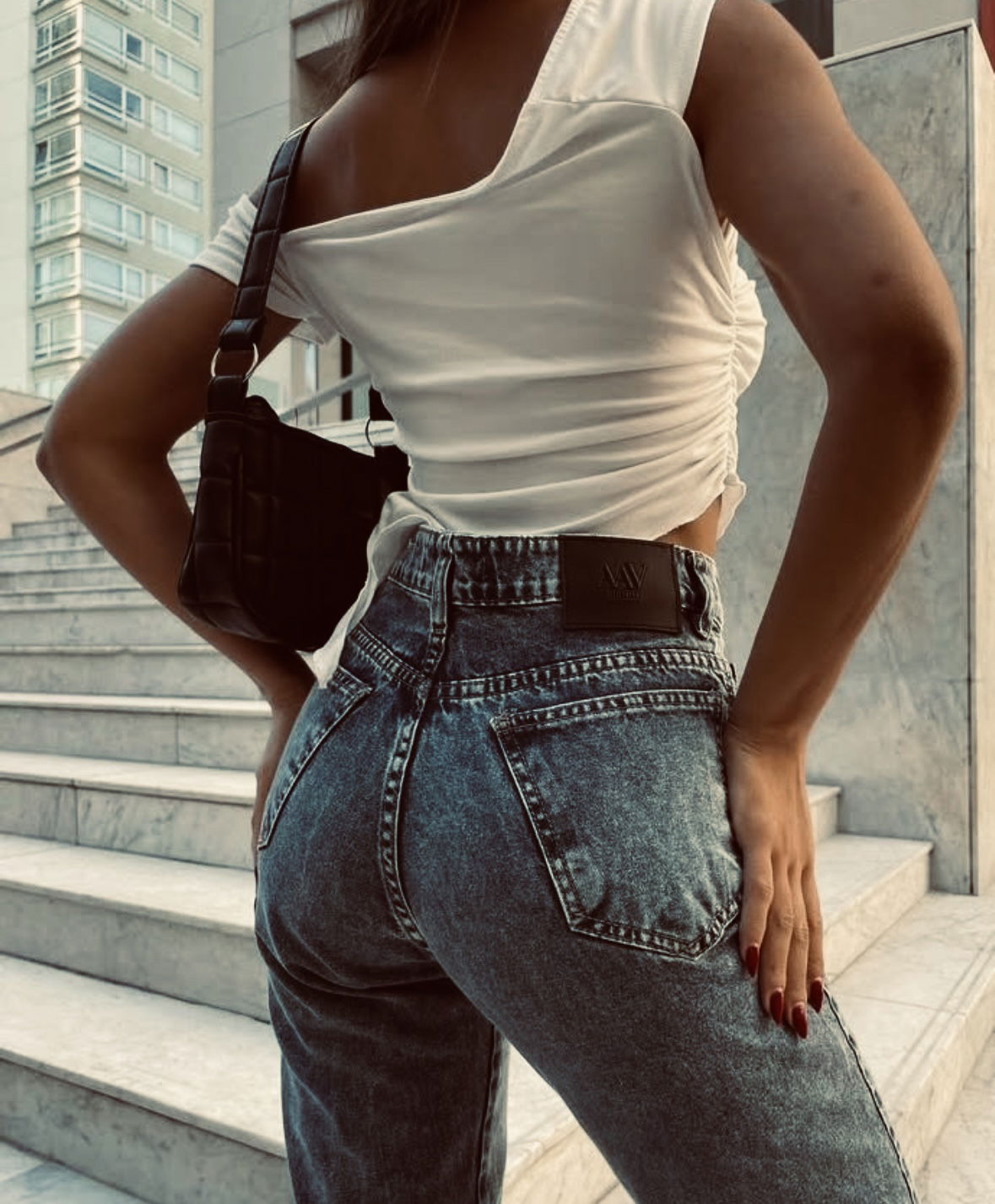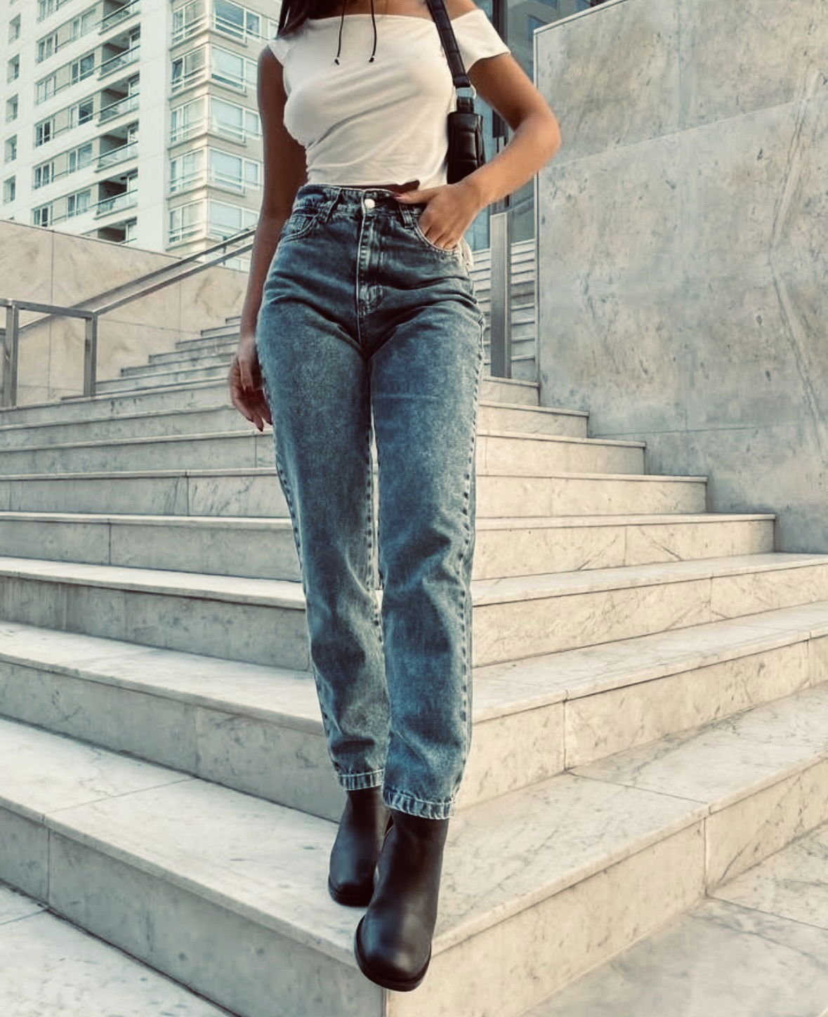 Nuestro Jean Mom en tono azul es ese jean atemporal que te salva cualquier look. Calce alto, corte relajado y una silueta que realza la figura sin dejar de ser cómodo. Ideal para usar con zapatillas, botas o lo que se te ocurra.