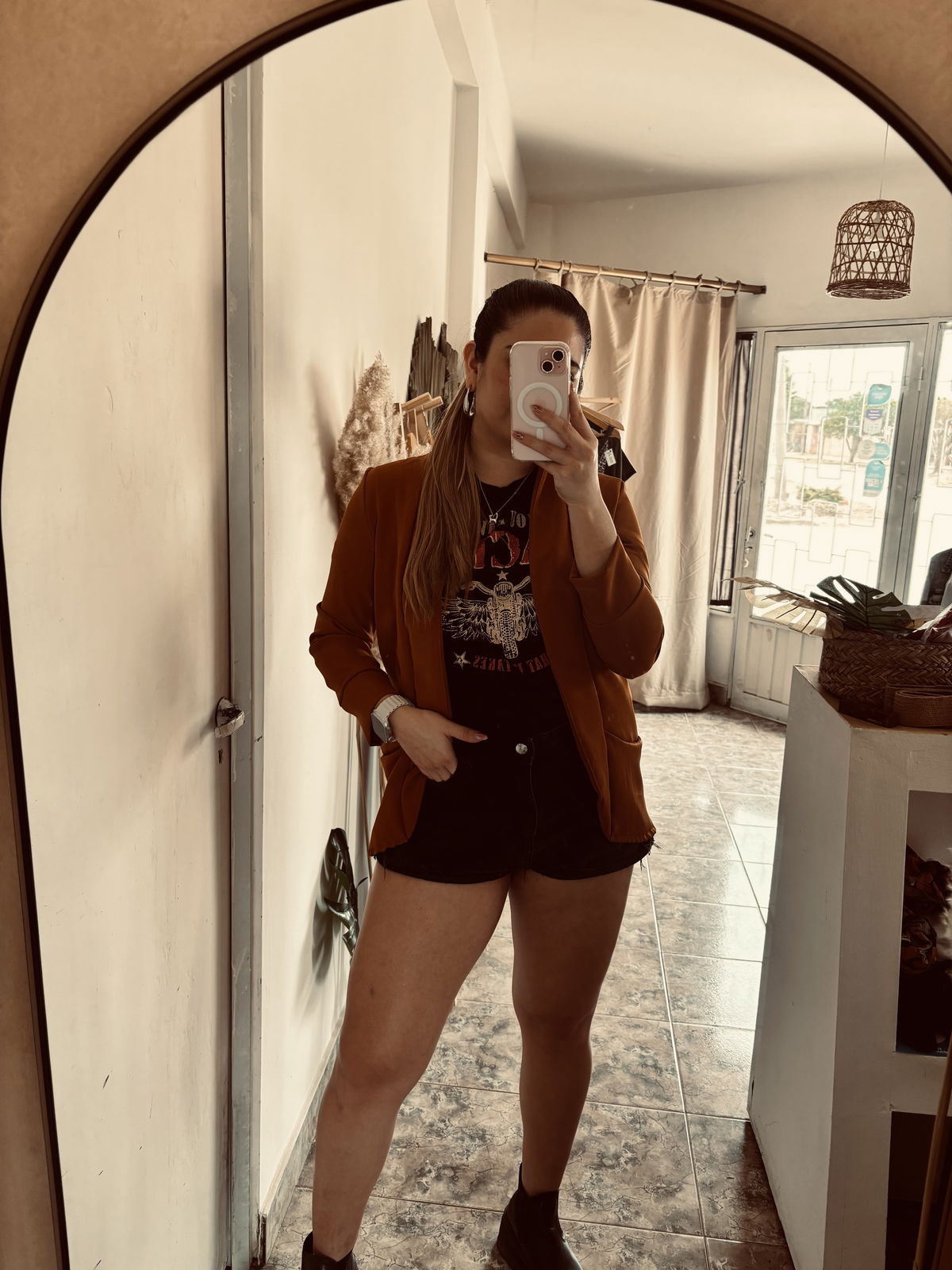 Nuestro blazer en color almendra es esa prenda comodín que eleva cualquier look. Confeccionado en crep sastrero, tiene una caída impecable y una textura suave que transmite elegancia sin esfuerzo. Su diseño relaxed y sin botones lo convierte en el complemento ideal tanto para la oficina como para un after. Combinalo con jeans, básicos o vestidos: siempre vas a verte estilosa.