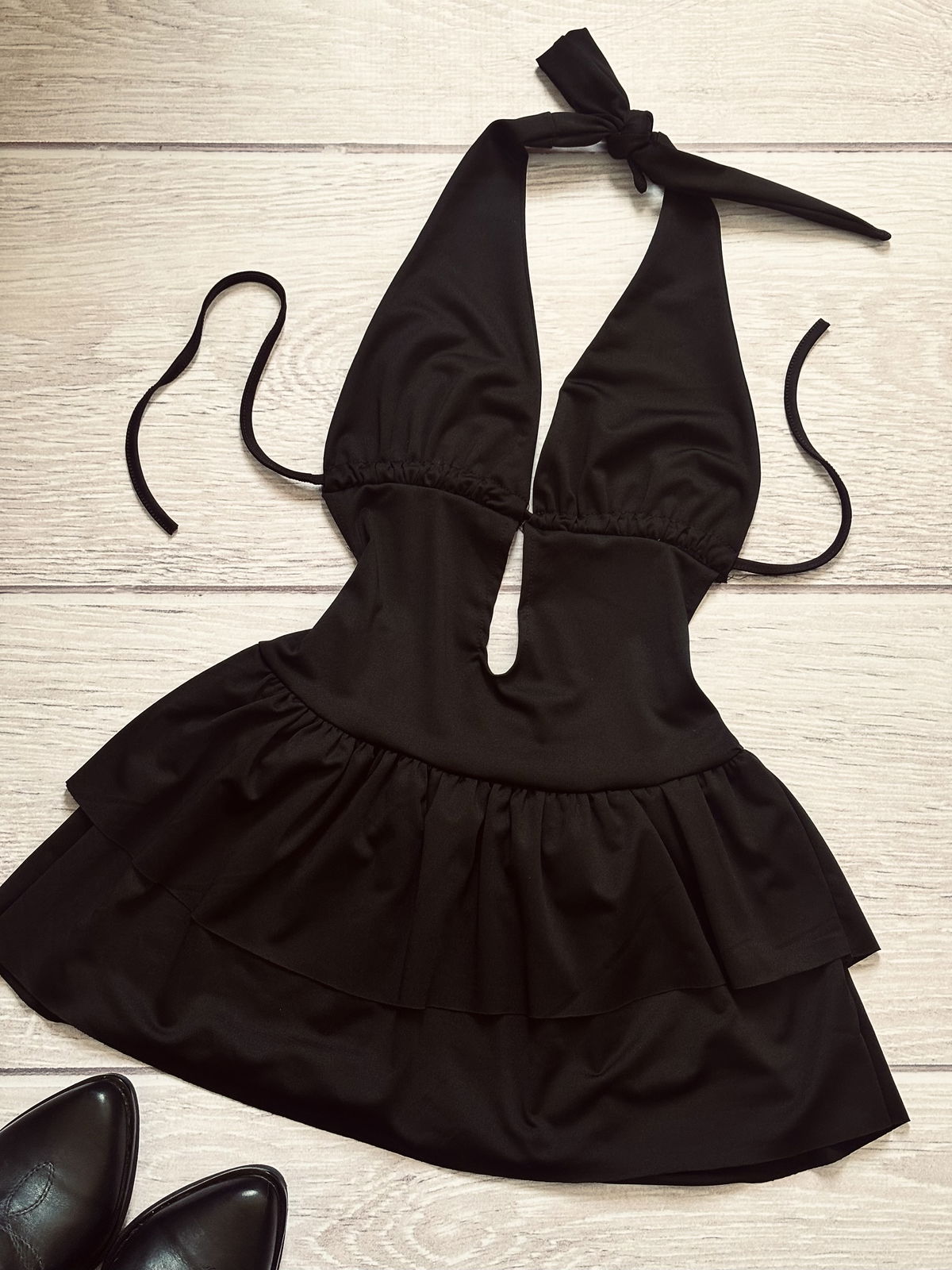 Minimalista, sexy y con mucho movimiento. Este vestido halter con escote profundo y corte cut out es perfecto para una salida nocturna o un evento donde quieras robarte todas las miradas.