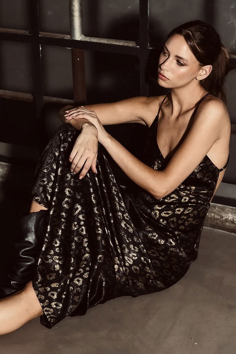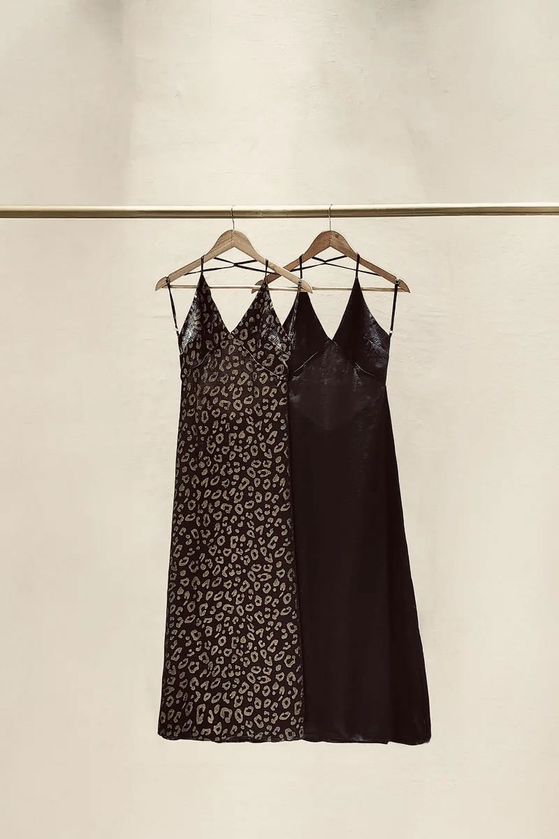 Un diseño impactante que combina elegancia y sensualidad. Confeccionado en seda con estampado animal print, este vestido de KREMIA se luce con su caída fluida y su calce que estiliza.