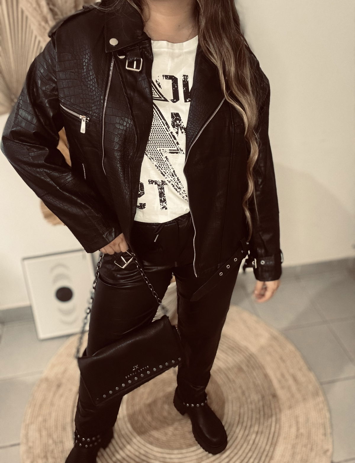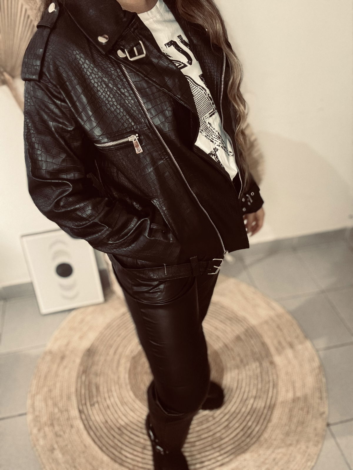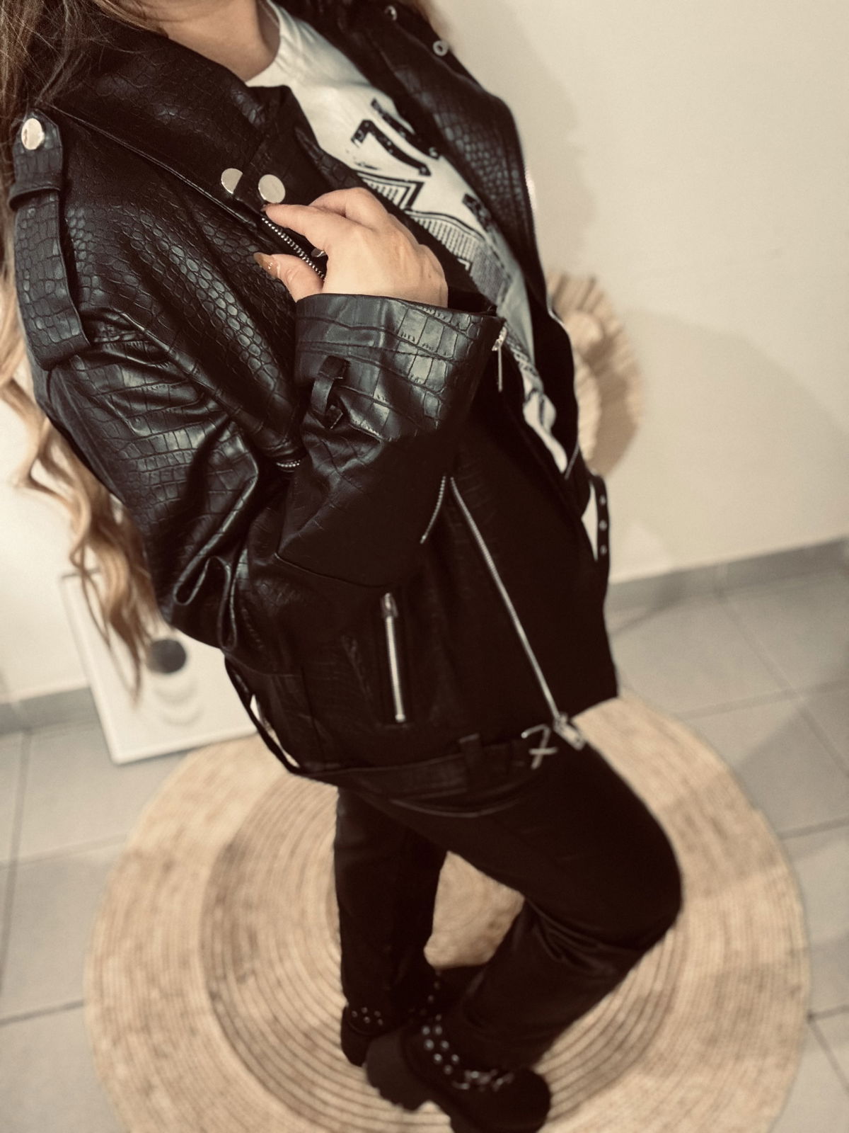 Campera de mujer importado estilo biker de calce oversize con cuello y solapa con detalle de broches metalicos. Tiene canesú con recortes en espalda. Posee cierres metálicos en delantero con tiracierre personalizado de la marca. Lleva cinturón con hebilla metálica al igual que las tiras regulables con hebilla metálica en puños. Tiras de ajuste con broches a presión metálicos en hombros. Largo modular hasta las segunda cadera. Acceso mediante cierre metálico. Confeccionado en cuerito croco y forrado con voile.