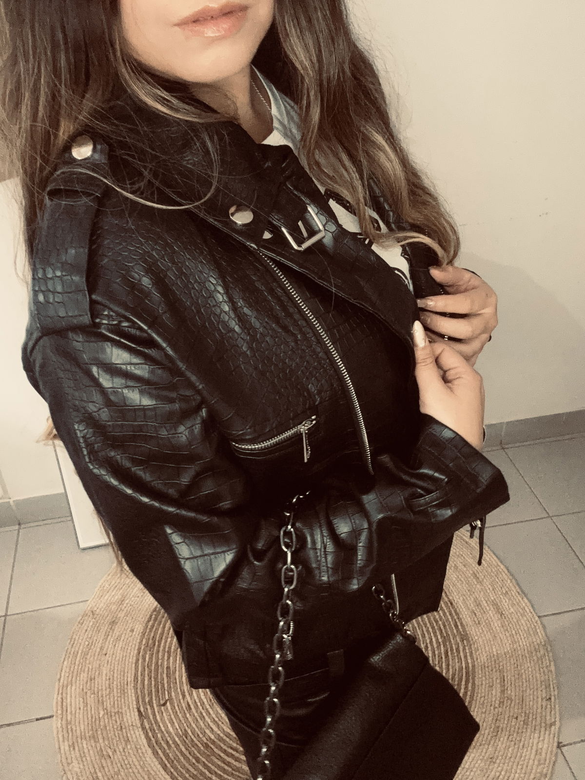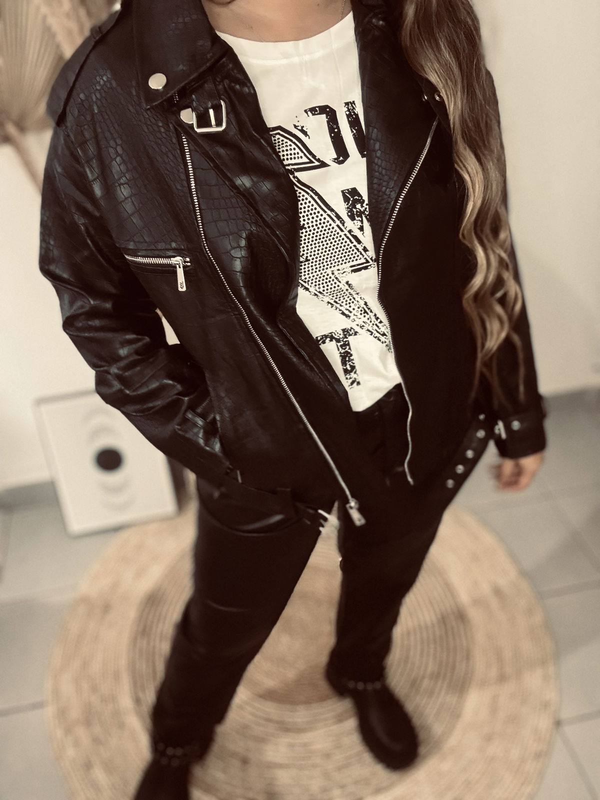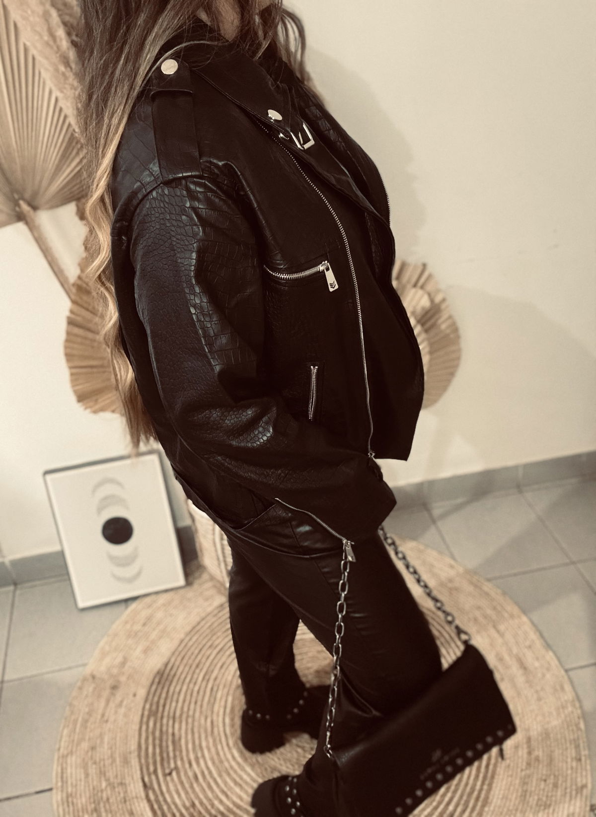 Campera de mujer importado estilo biker de calce oversize con cuello y solapa con detalle de broches metalicos. Tiene canesú con recortes en espalda. Posee cierres metálicos en delantero con tiracierre personalizado de la marca. Lleva cinturón con hebilla metálica al igual que las tiras regulables con hebilla metálica en puños. Tiras de ajuste con broches a presión metálicos en hombros. Largo modular hasta las segunda cadera. Acceso mediante cierre metálico. Confeccionado en cuerito croco y forrado con voile.