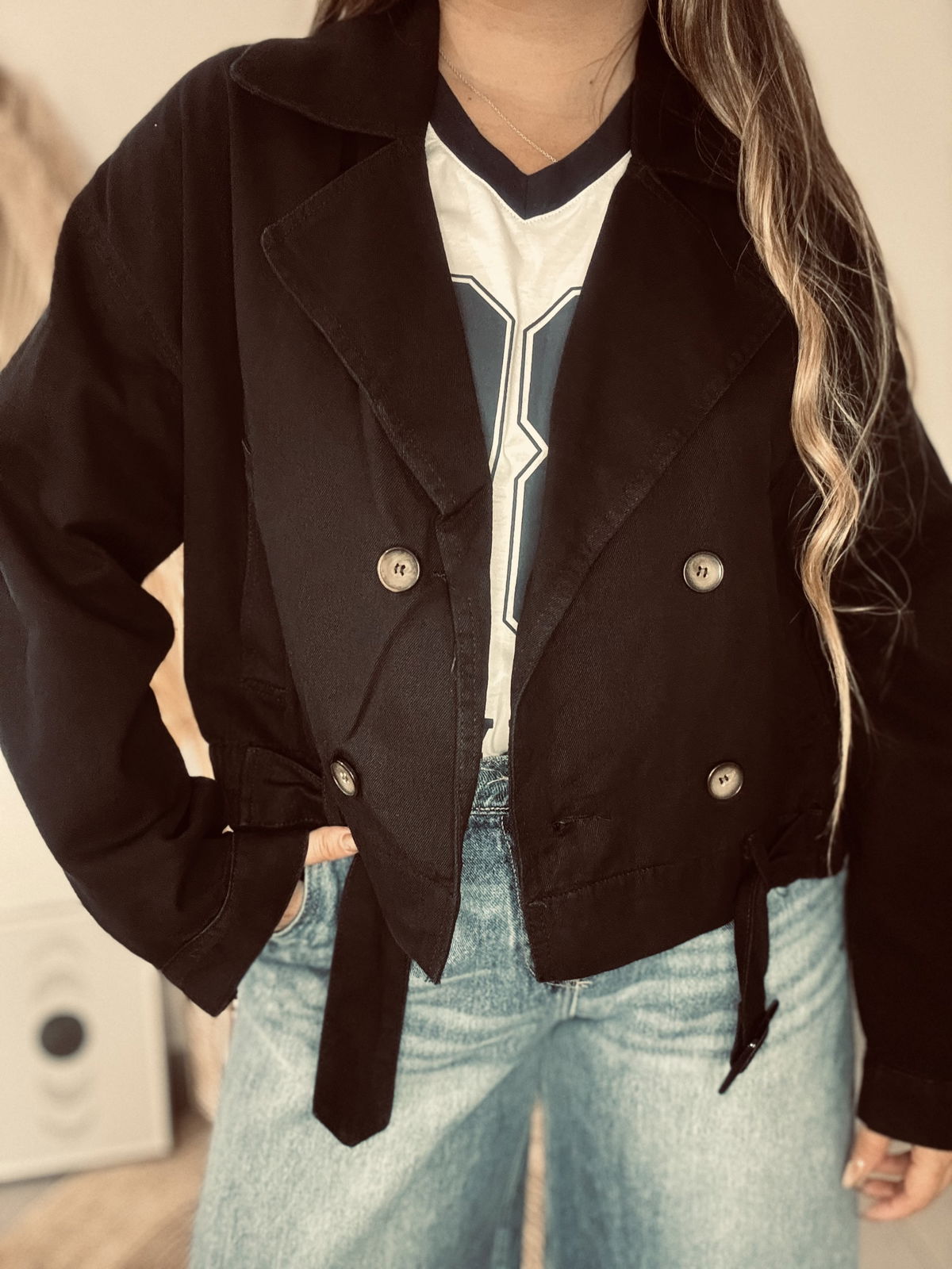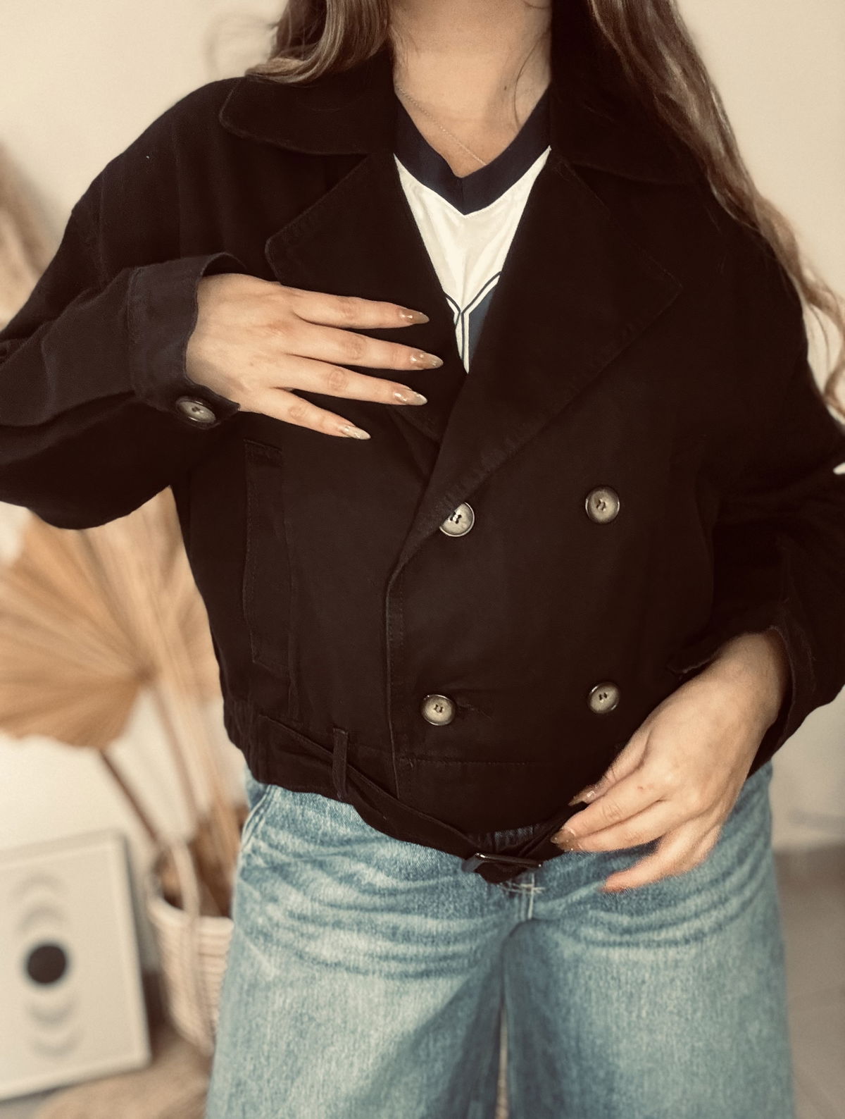 Trench de mujer de gabardina, de calce oversize, de largo modular hasta la primera cadera. Posee cuello y solapa cruzada, con cruce de cuatro botones y bolsillos ojal. Los puños cuentan con tiras de ajuste y presillas con botones. Confeccionada en gabardina.