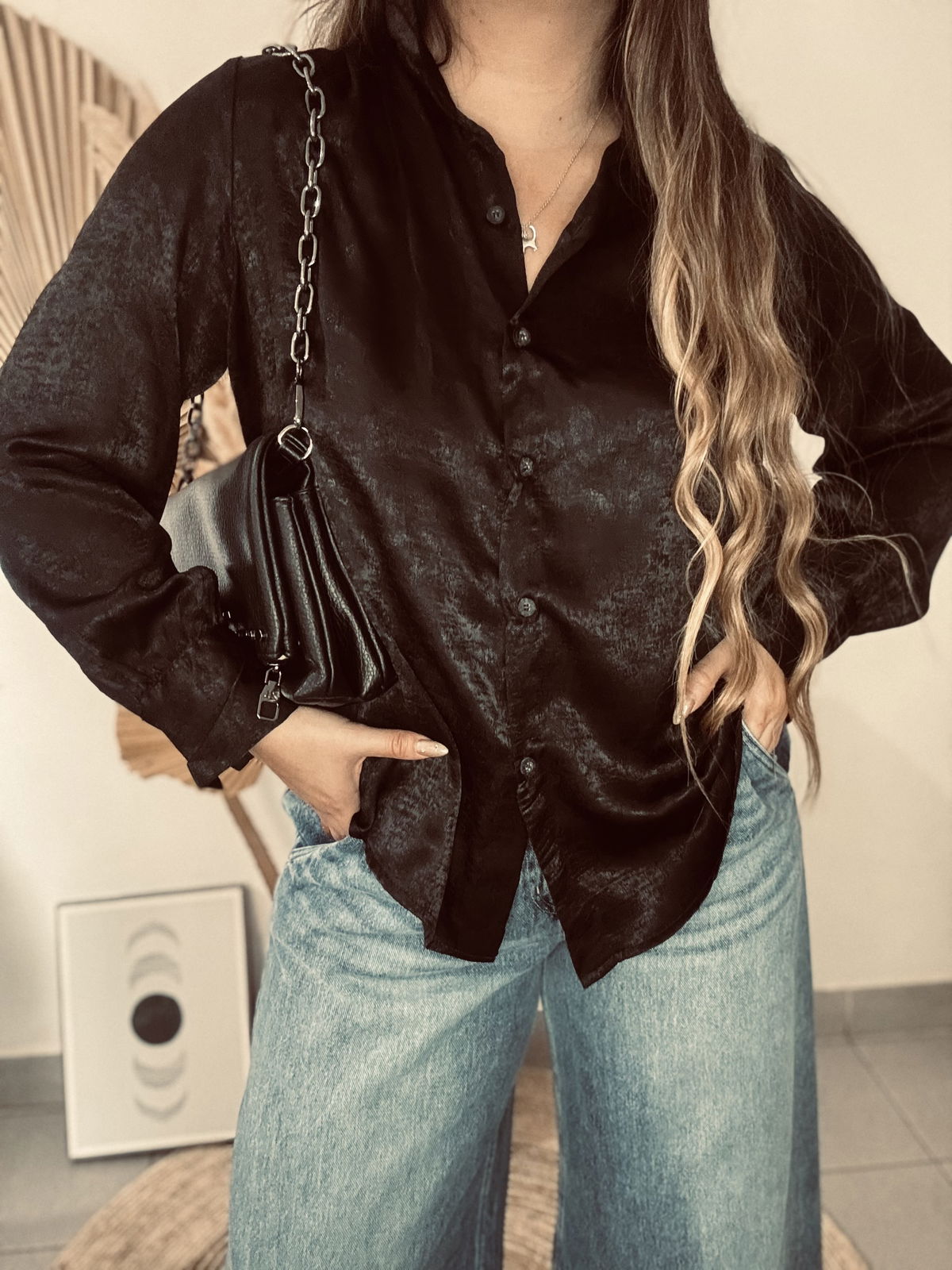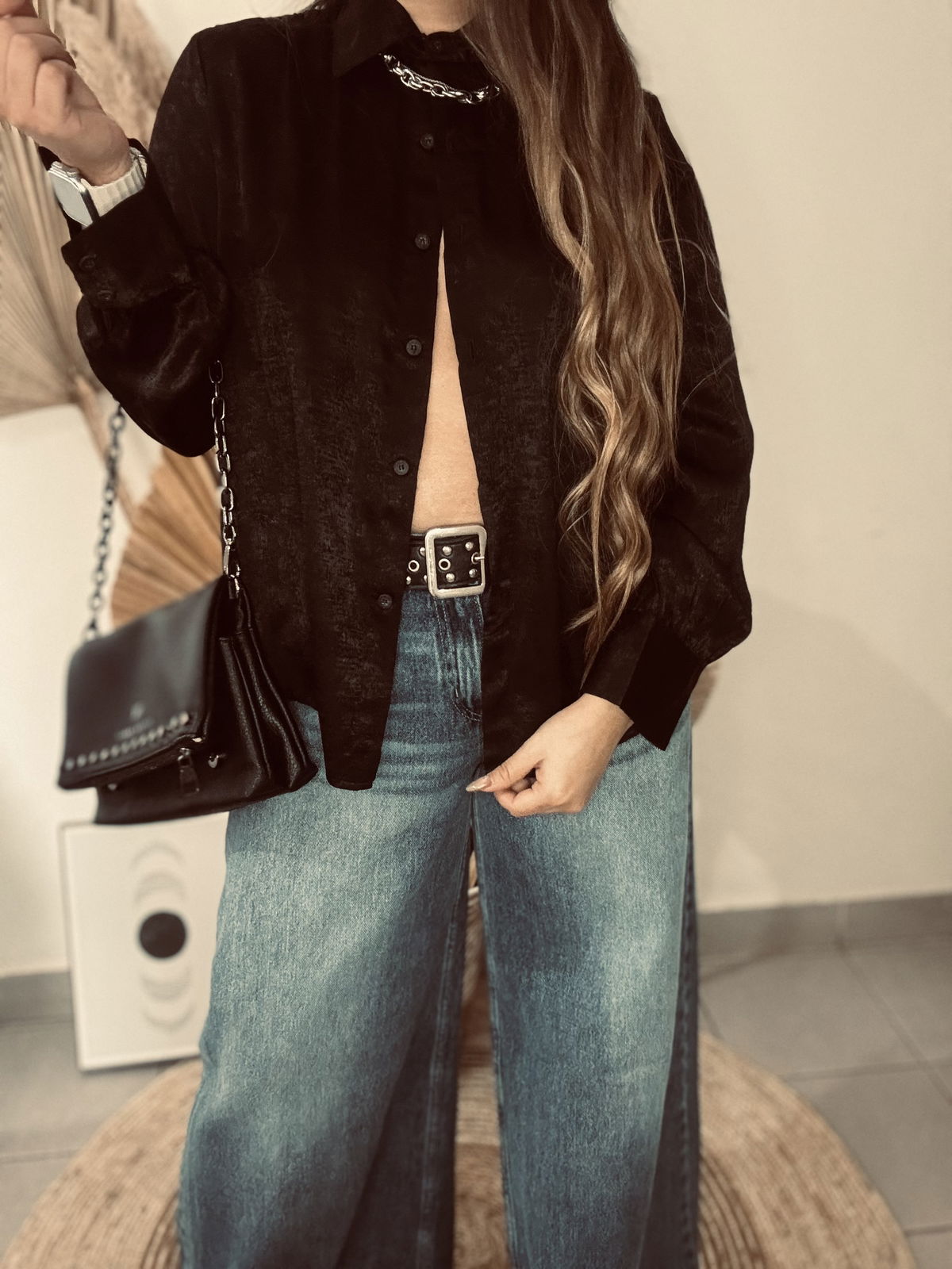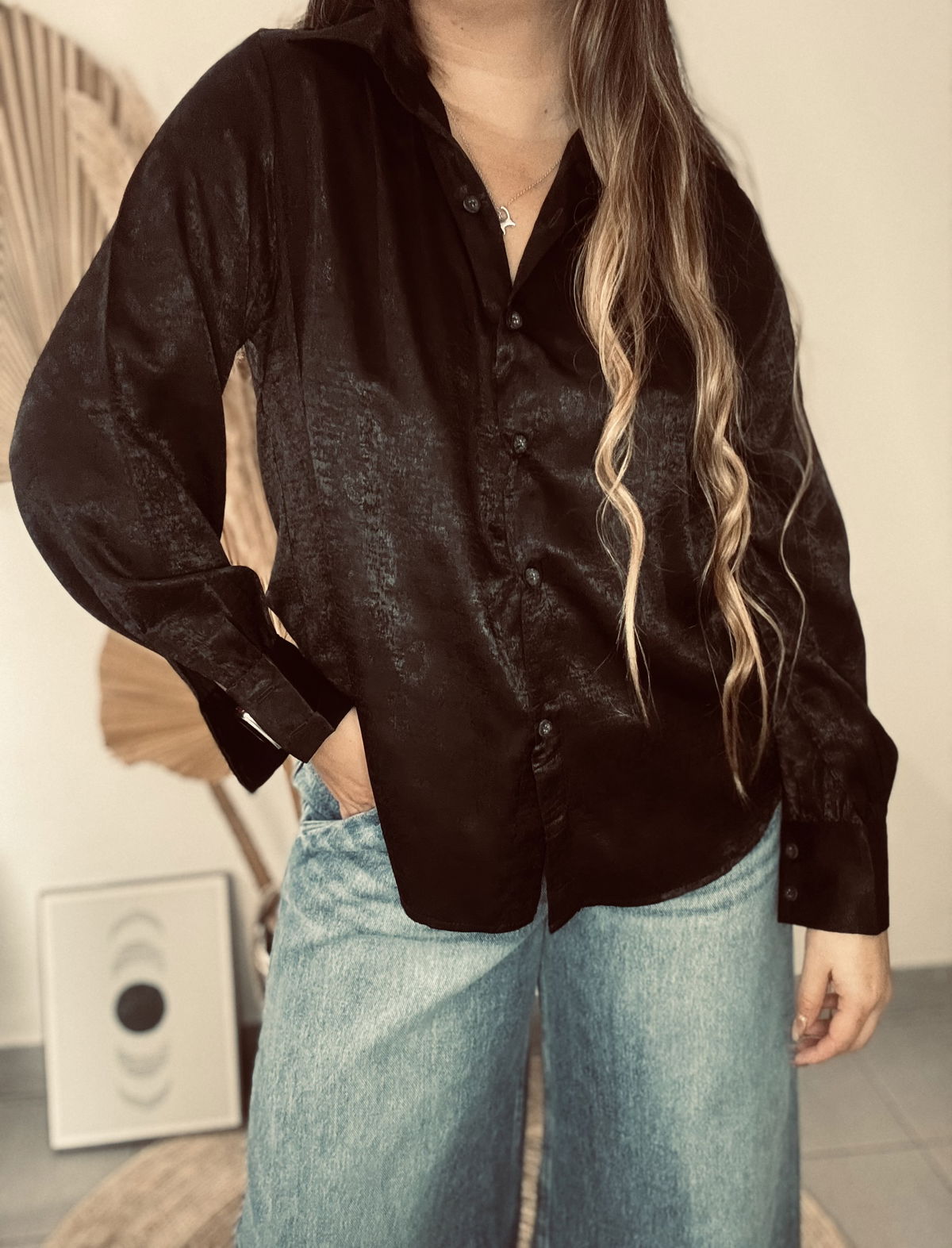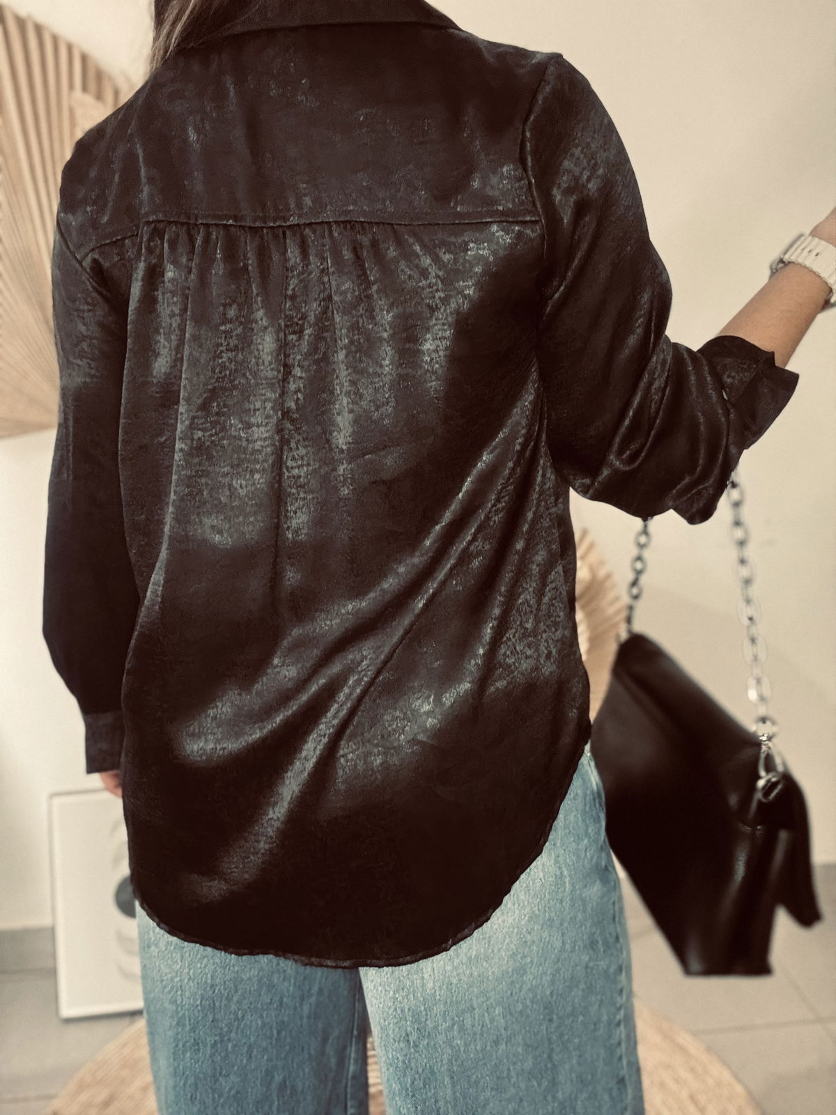 Camisa de mujer clásica larga hasta la cadera con frunces en el canesú de la espalda y en puños. Acceso mediante botones camiseros negros. En la tela viene con estampa animal print con foil. Confeccionado en sedita con Foil Animal Print.
