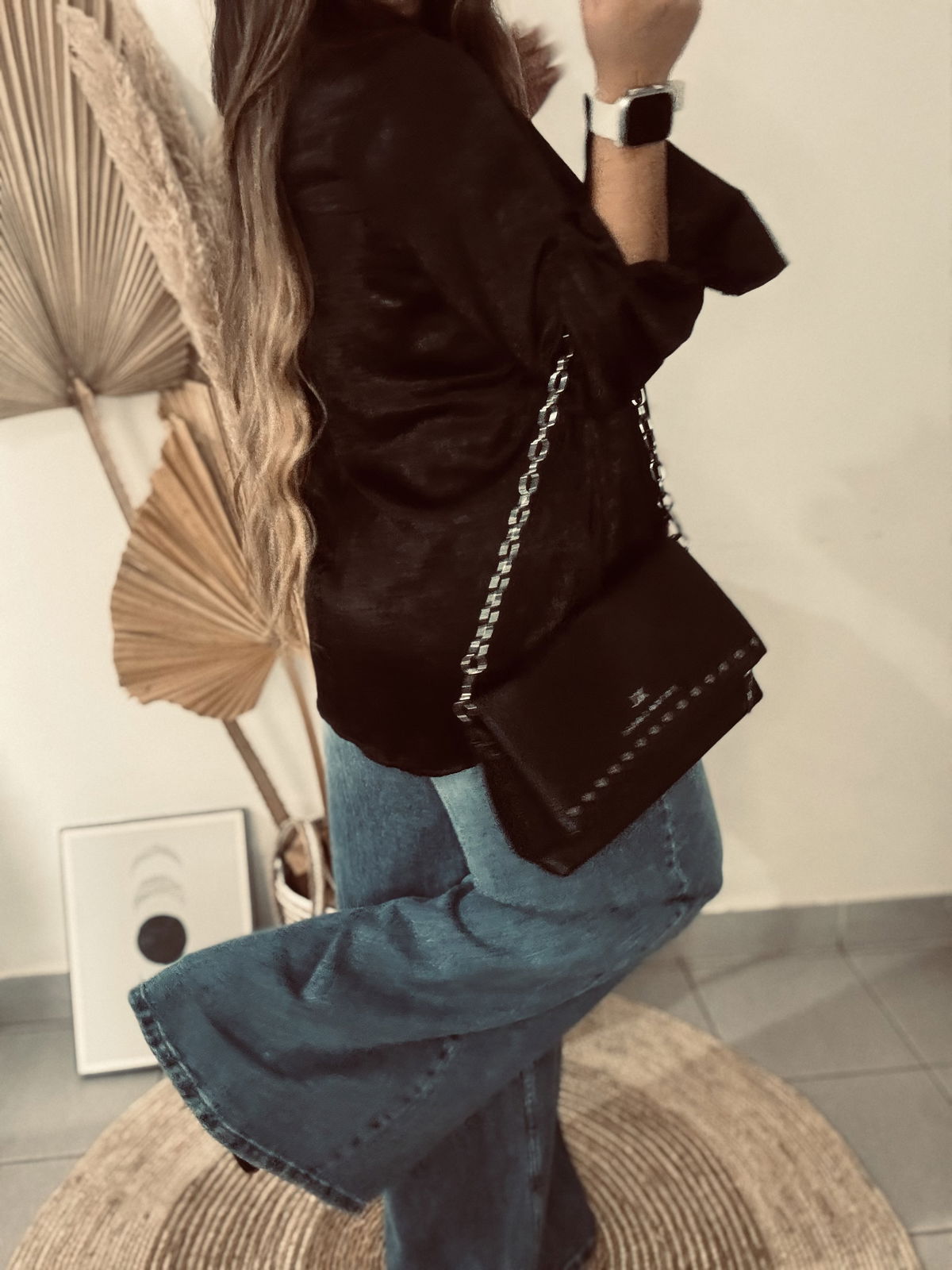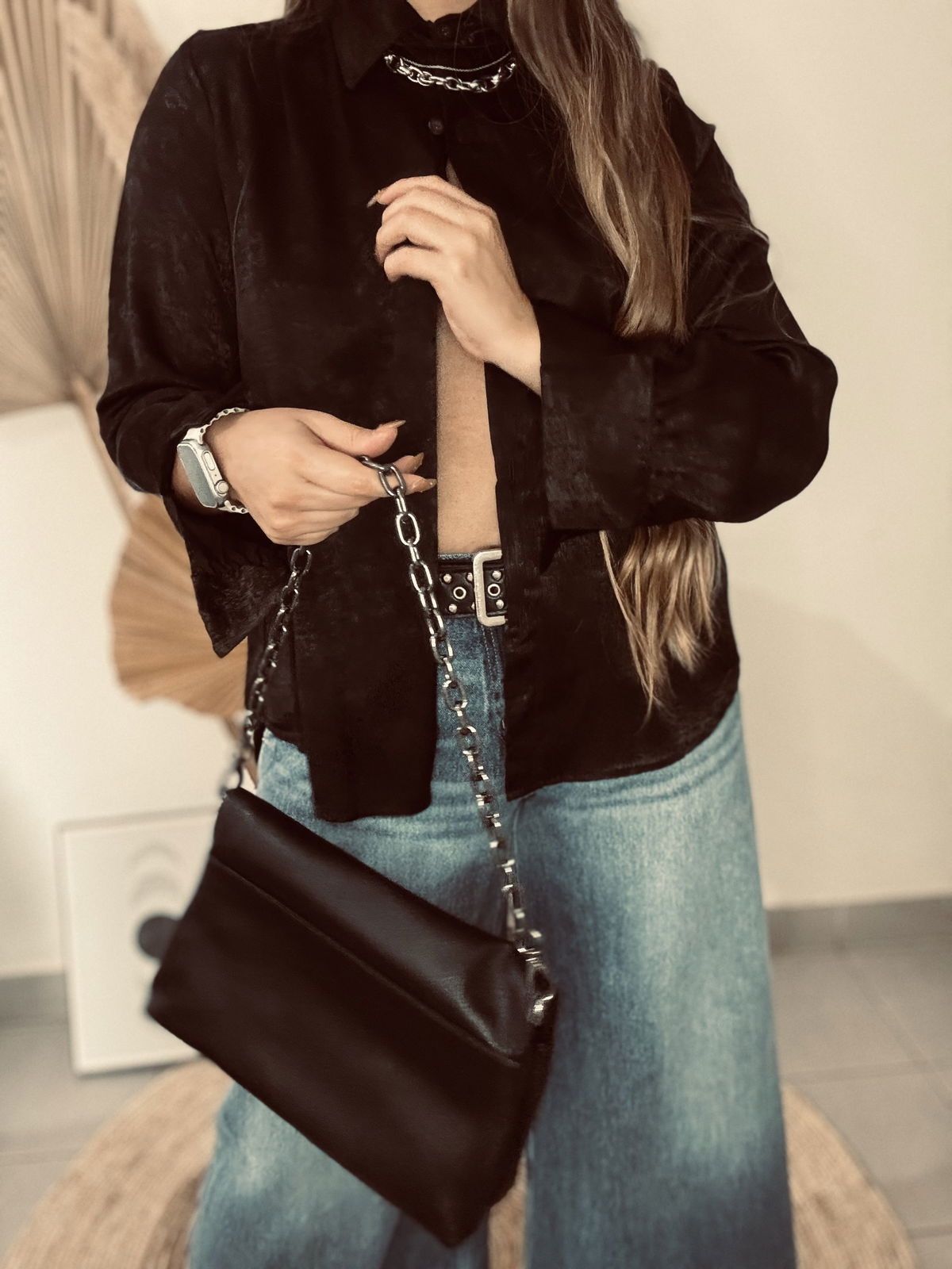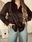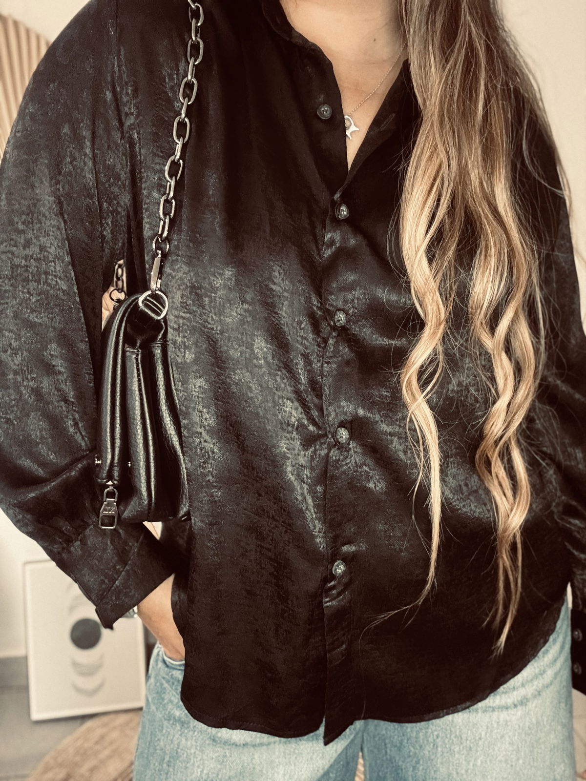 Camisa de mujer clásica larga hasta la cadera con frunces en el canesú de la espalda y en puños. Acceso mediante botones camiseros negros. En la tela viene con estampa animal print con foil. Confeccionado en sedita con Foil Animal Print.
