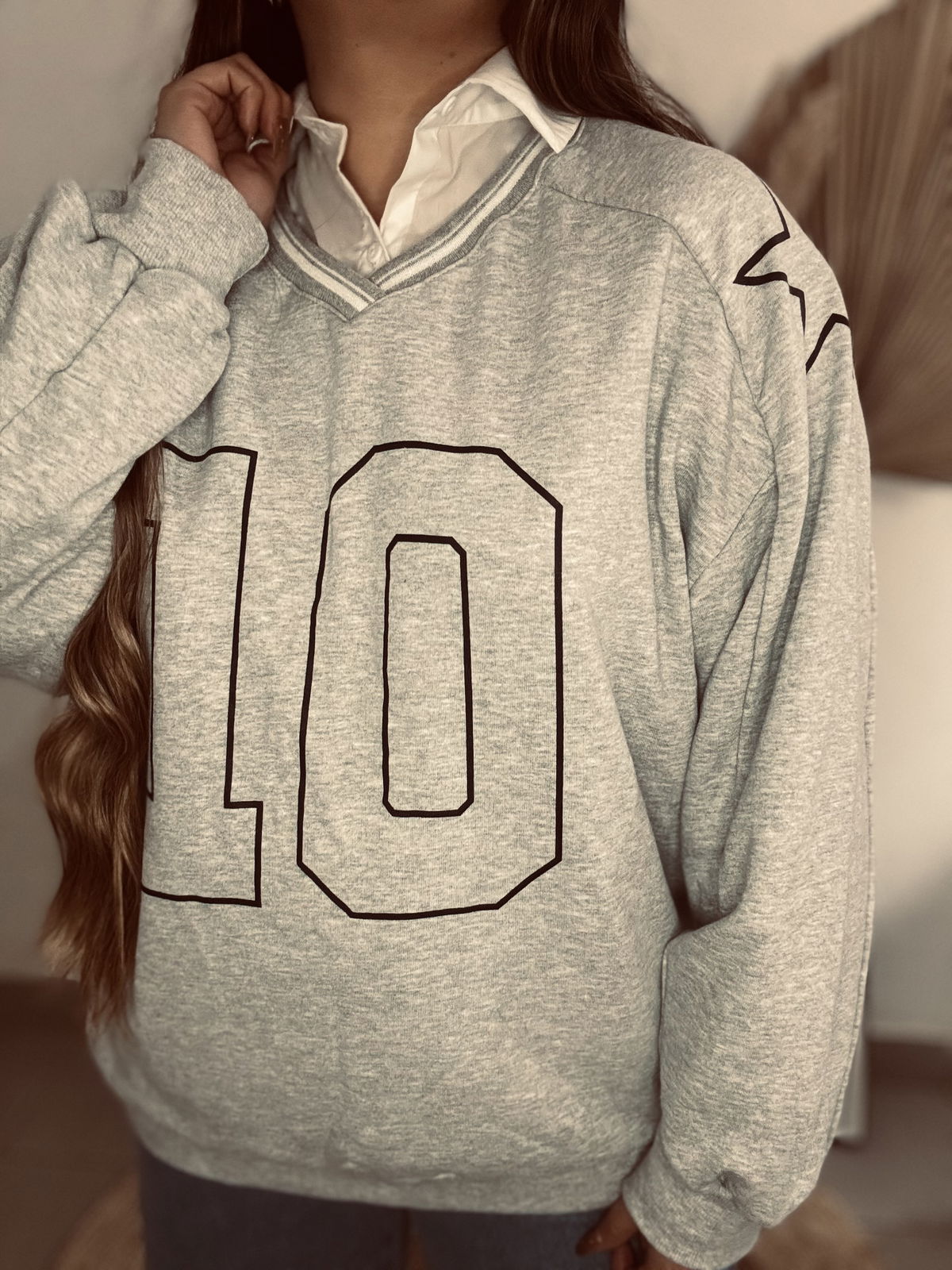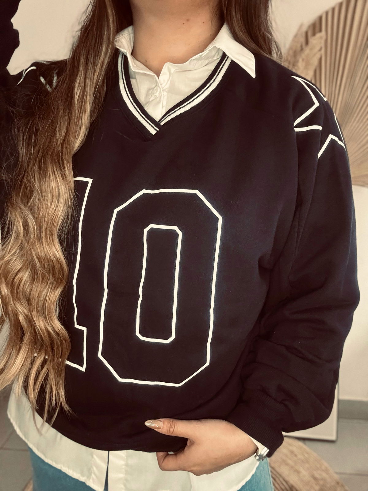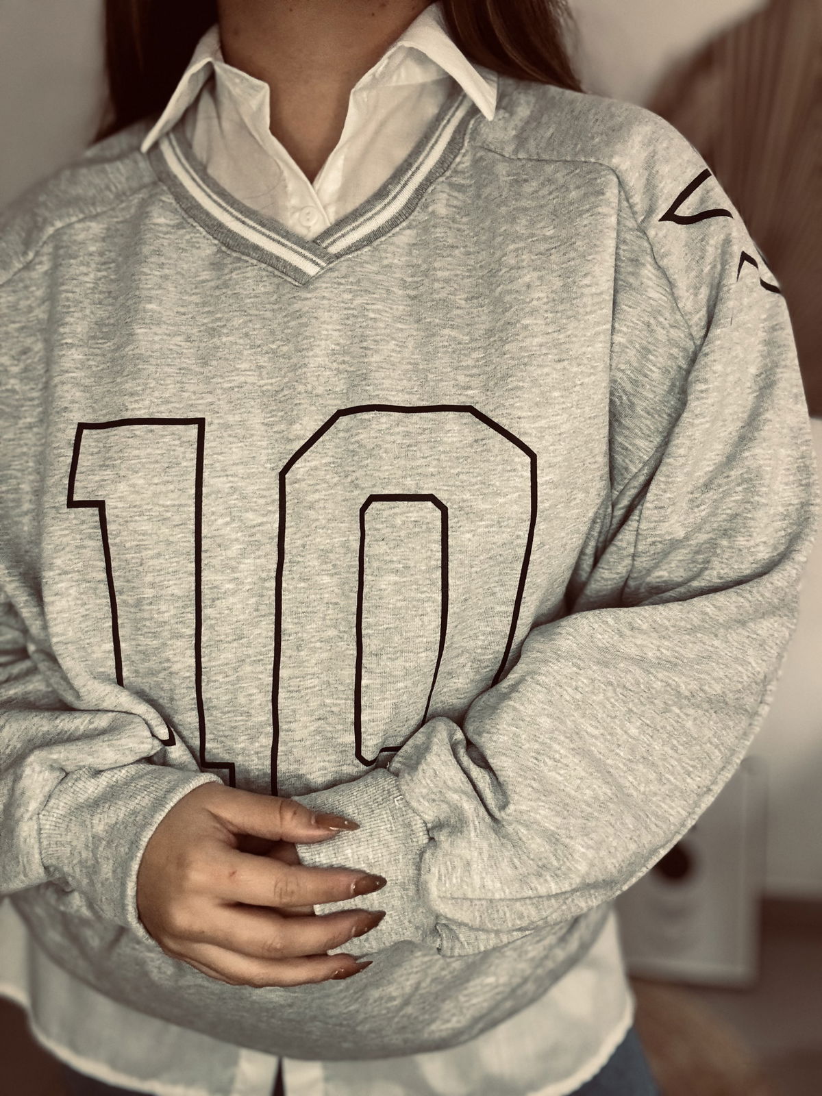 Buzo de mujer de calce oversize manga larga raglán con escote en V y cuello polo tejido con trama de líneas al tono. Lleva estampa en delantero. Confeccionado en rústico de algodón con complemento de rib en cintura y puños.