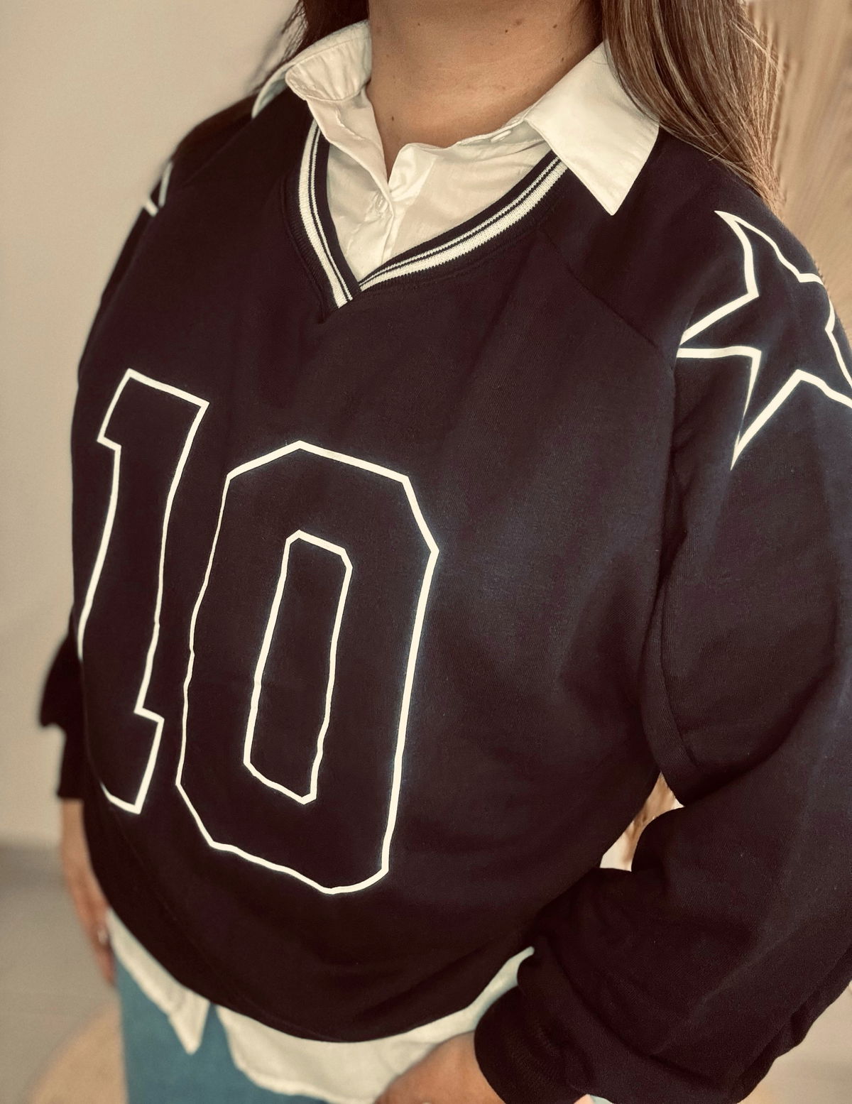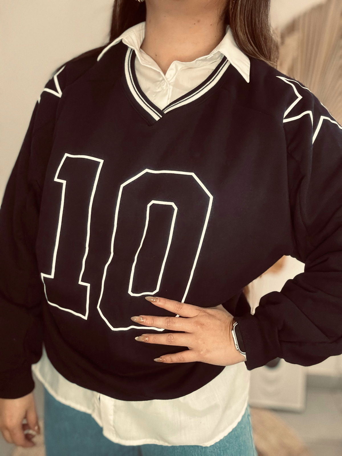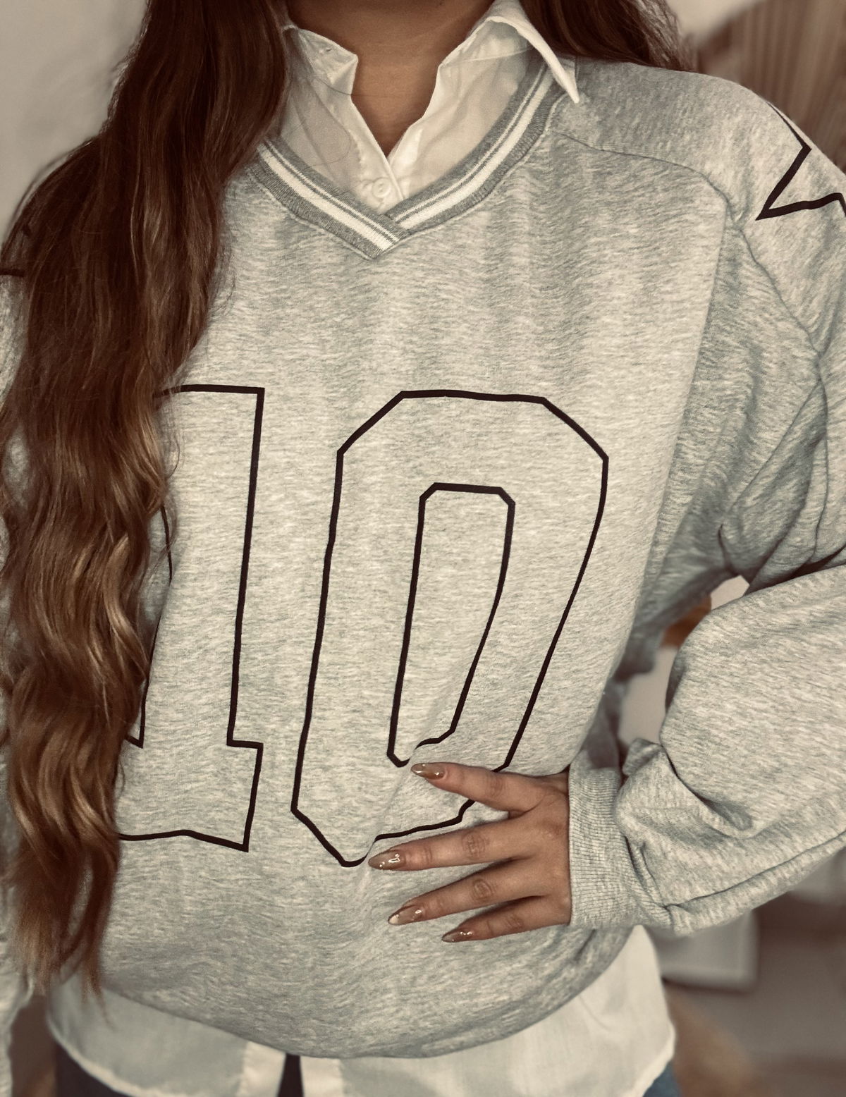 Buzo de mujer de calce oversize manga larga raglán con escote en V y cuello polo tejido con trama de líneas al tono. Lleva estampa en delantero. Confeccionado en rústico de algodón con complemento de rib en cintura y puños.