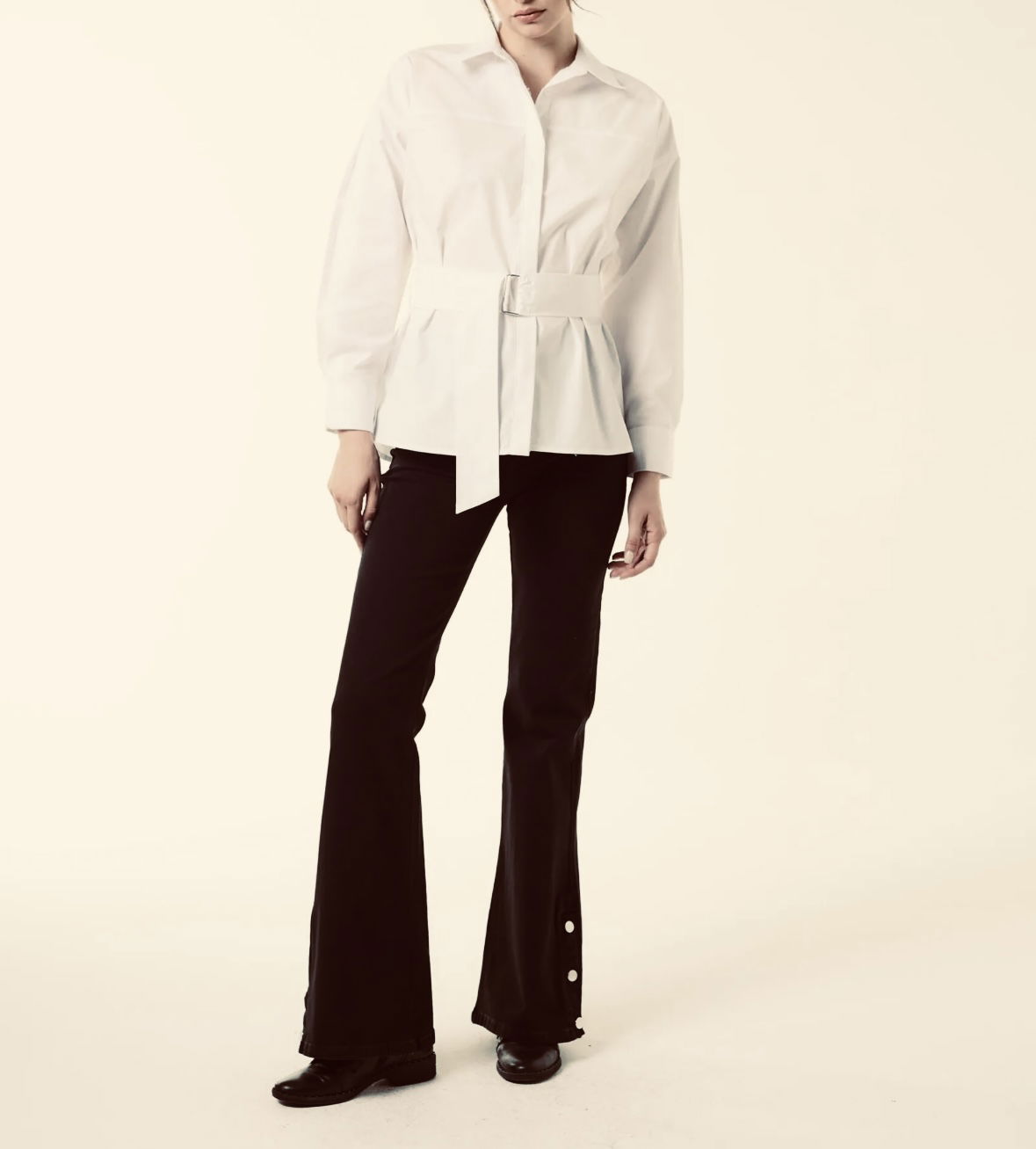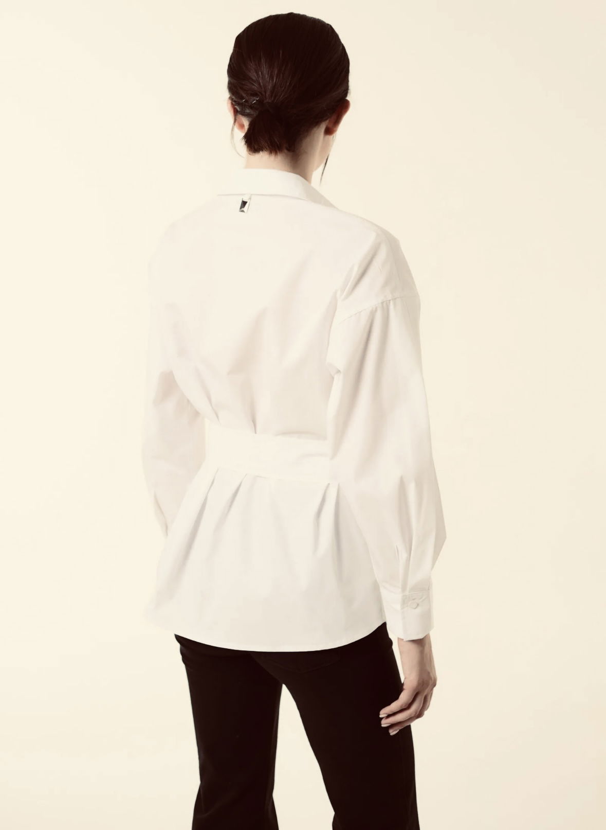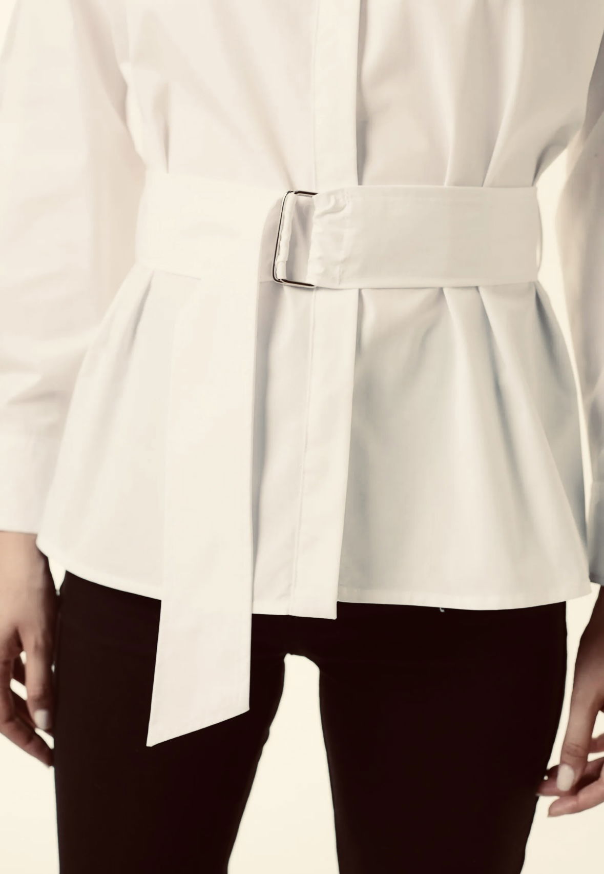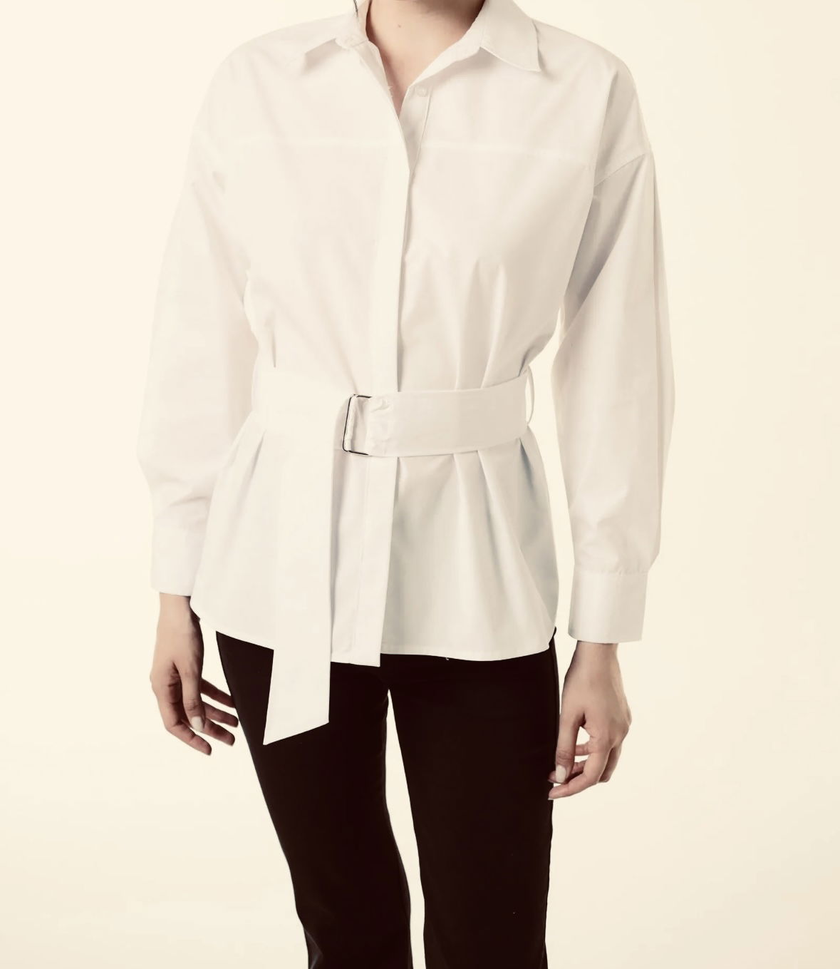 Camisa manga larga de calce recto con canesú delantero y lazo del mismo material, con dos pases metálicos para ajustar el lazo. Posee detalle de chapita metálica personalizada de la marca. Es larga hasta las caderas y está confeccionada en tela de poplín camisero.