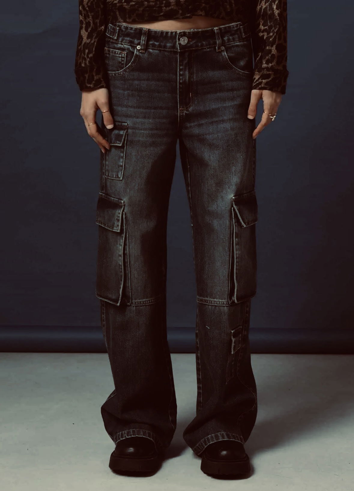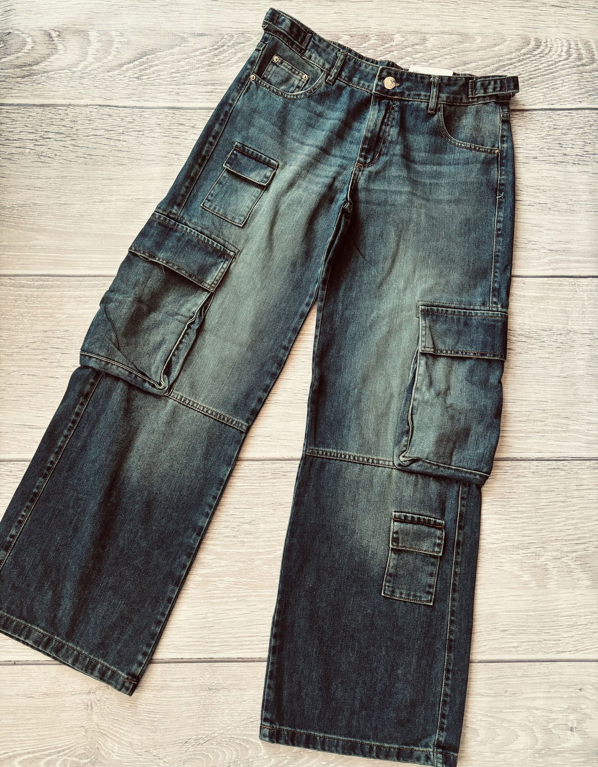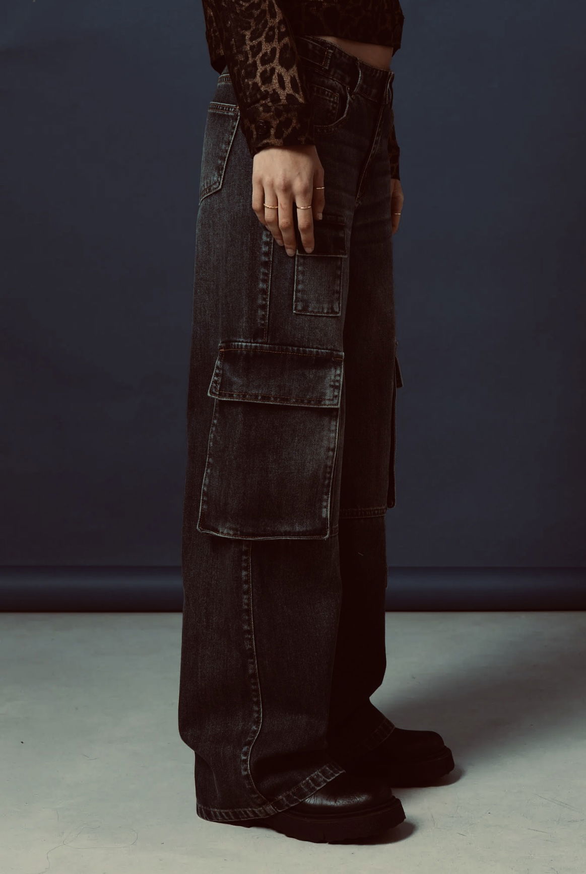 Jean cargo tiro bajo con bolsillos plaqué y bolsillos en costados. Espalda con pinza doble y detalle de bolsillos fantasía. Acceso mediante cierre y botón con cintura con presillas.