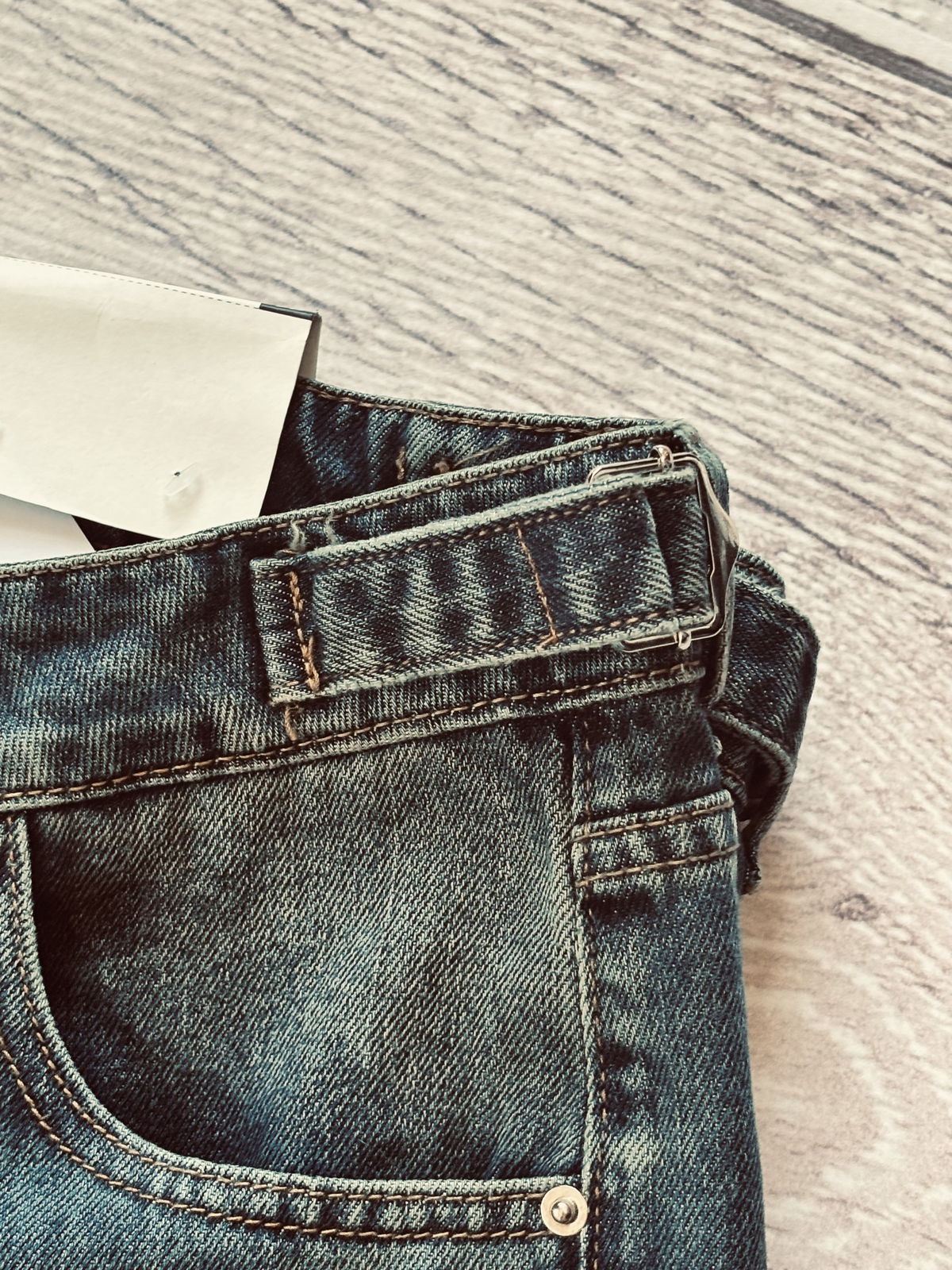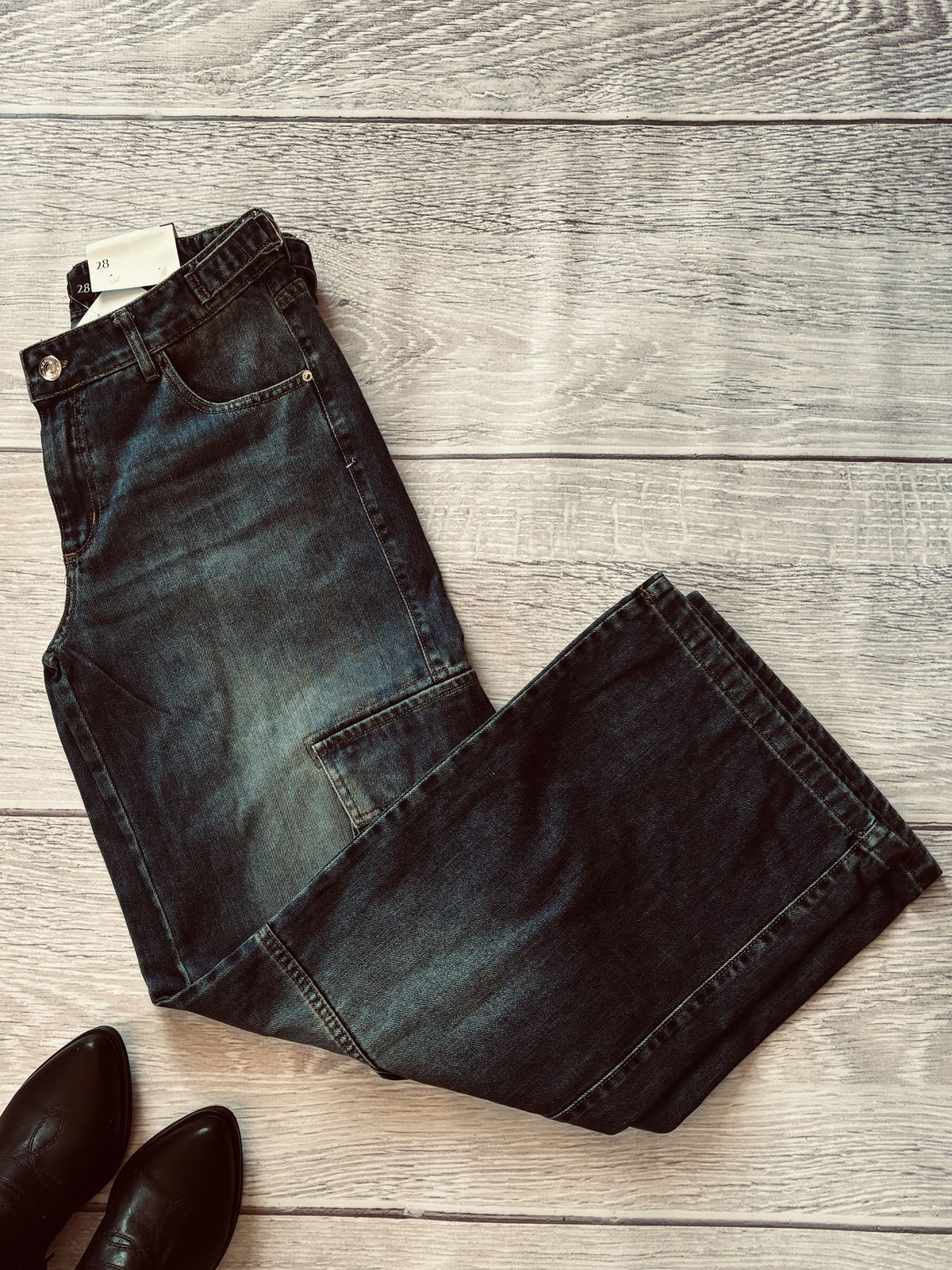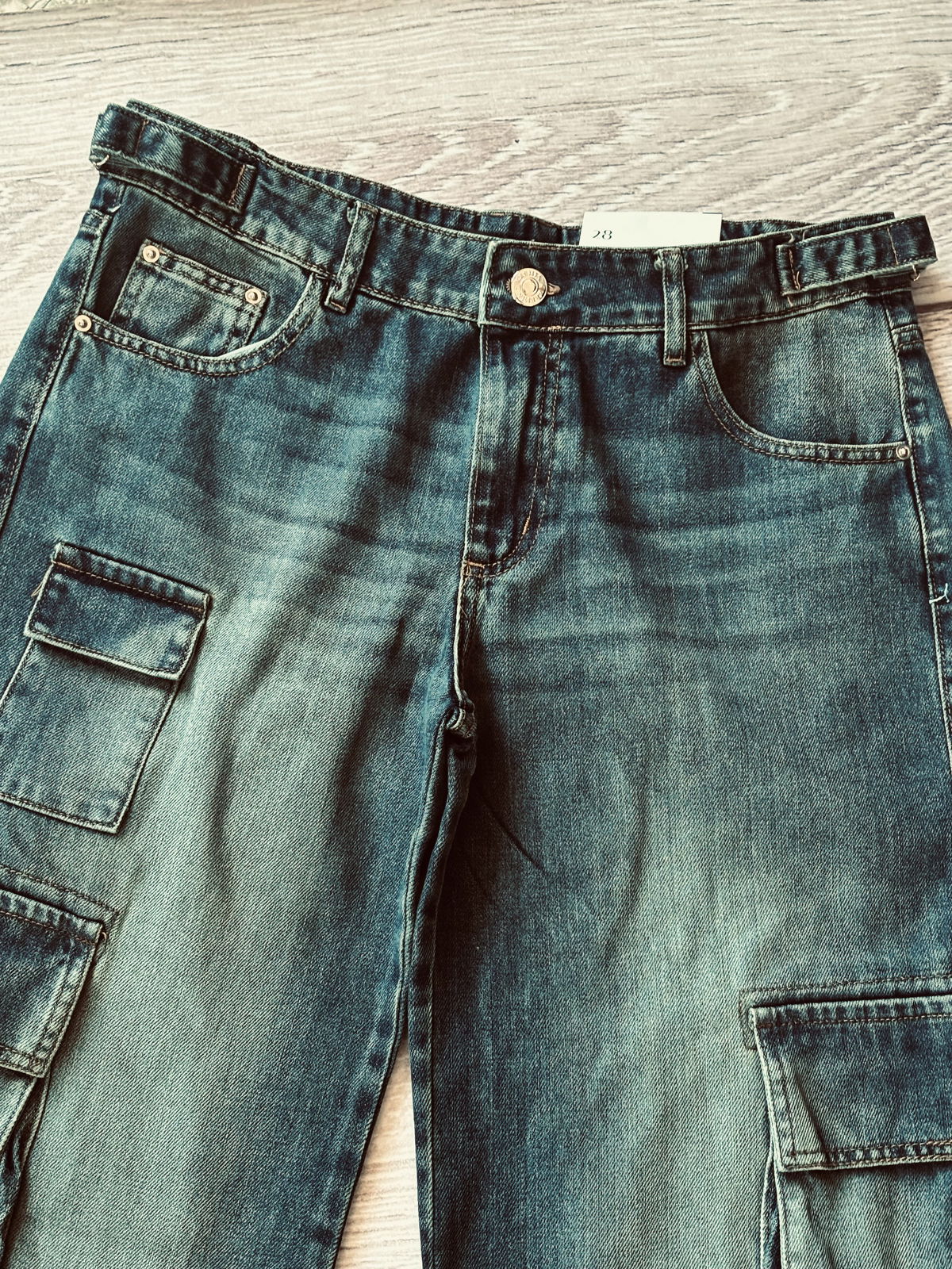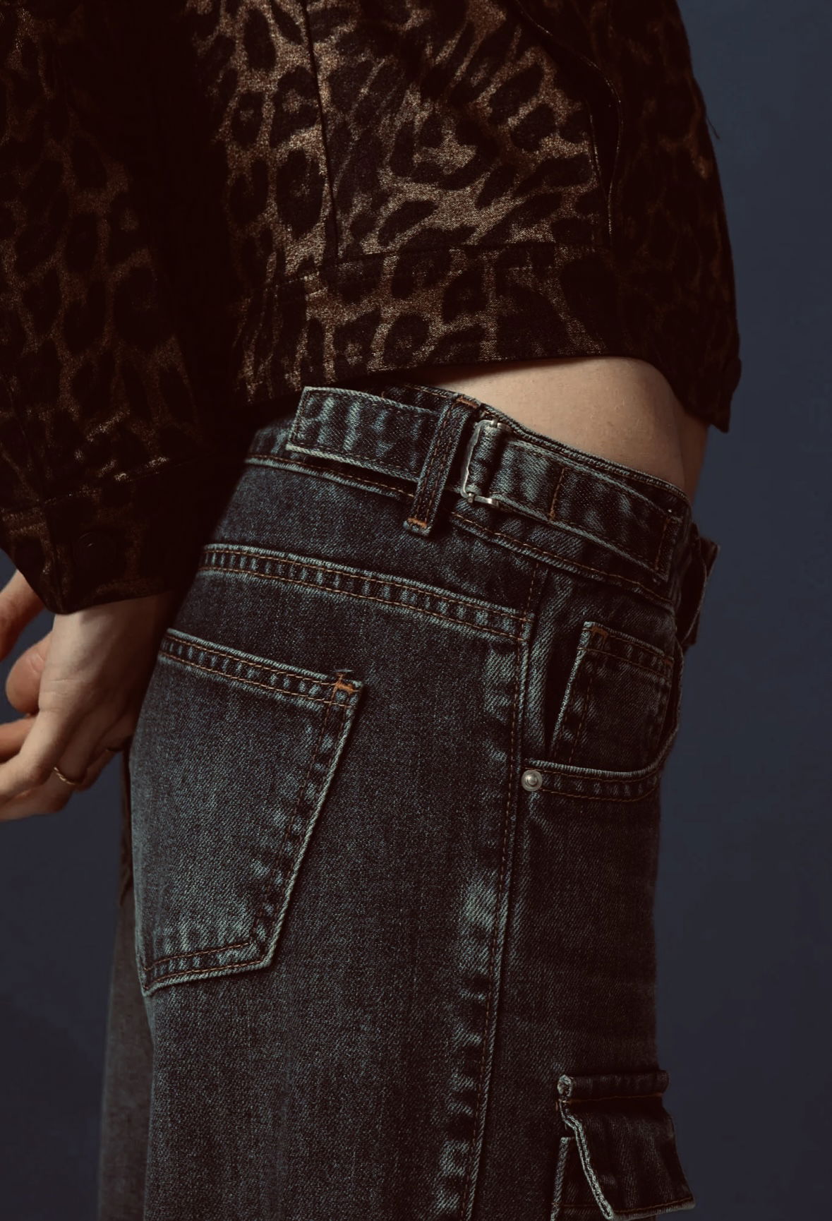 Jean cargo tiro bajo con bolsillos plaqué y bolsillos en costados. Espalda con pinza doble y detalle de bolsillos fantasía. Acceso mediante cierre y botón con cintura con presillas.