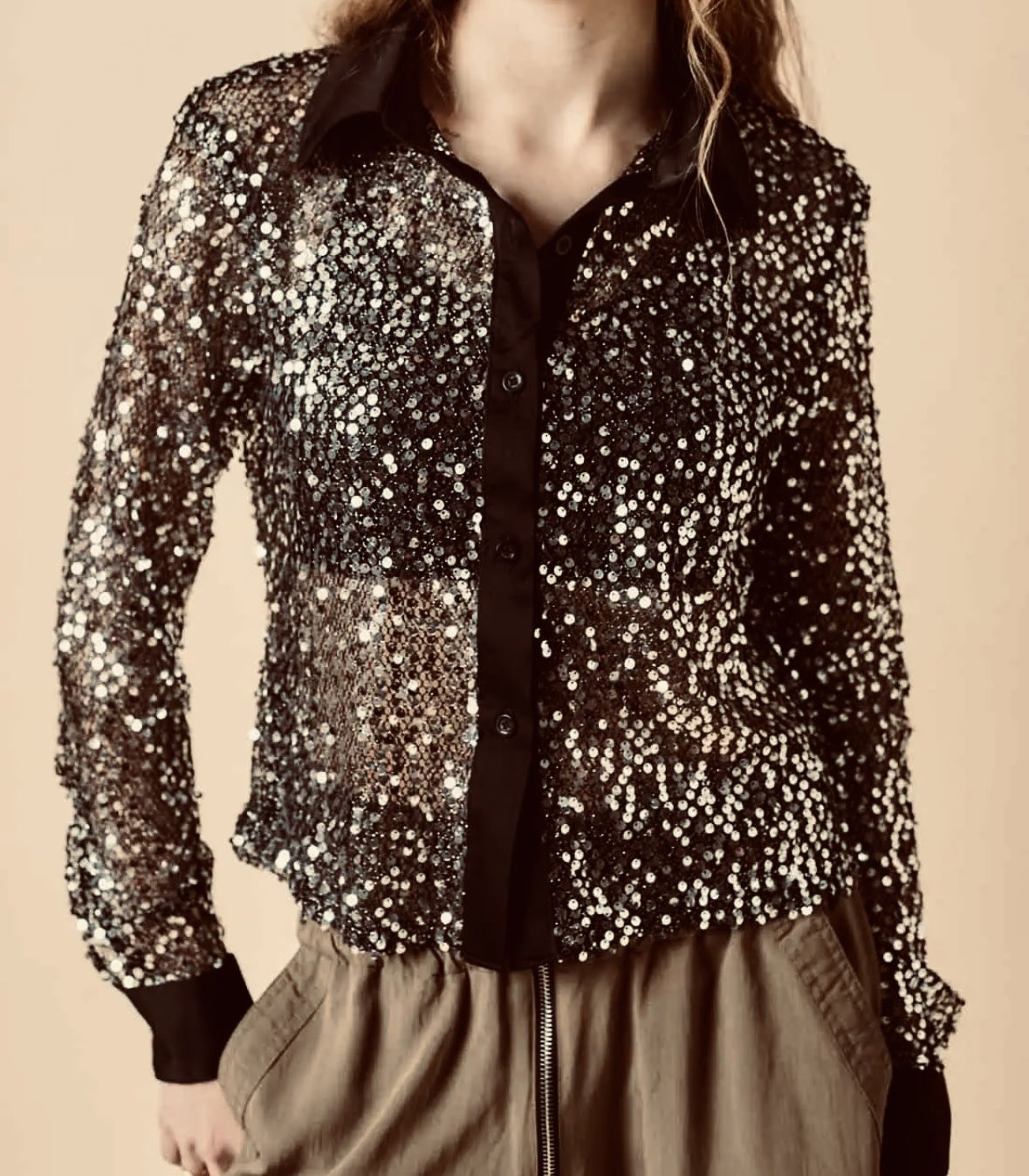 Camisa elastizada hecha de red de lentejuelas combinada de sedita pesada en cuello y puños.