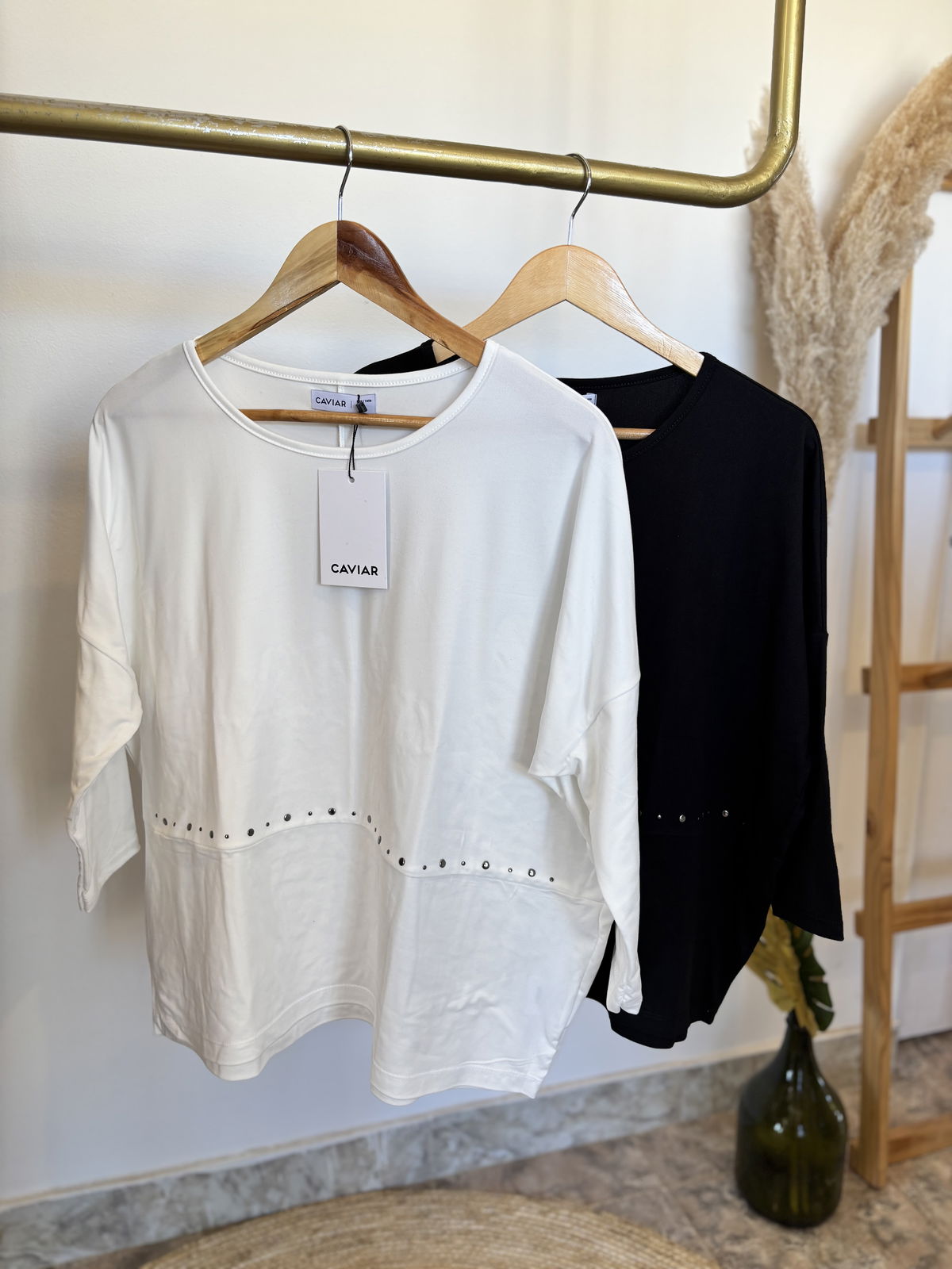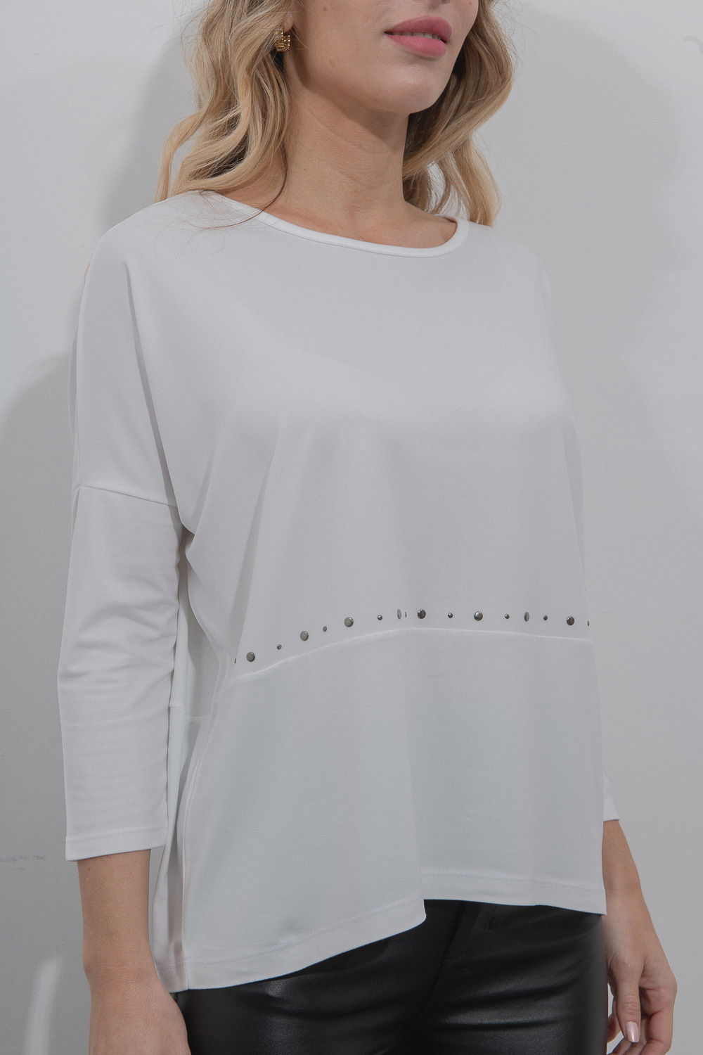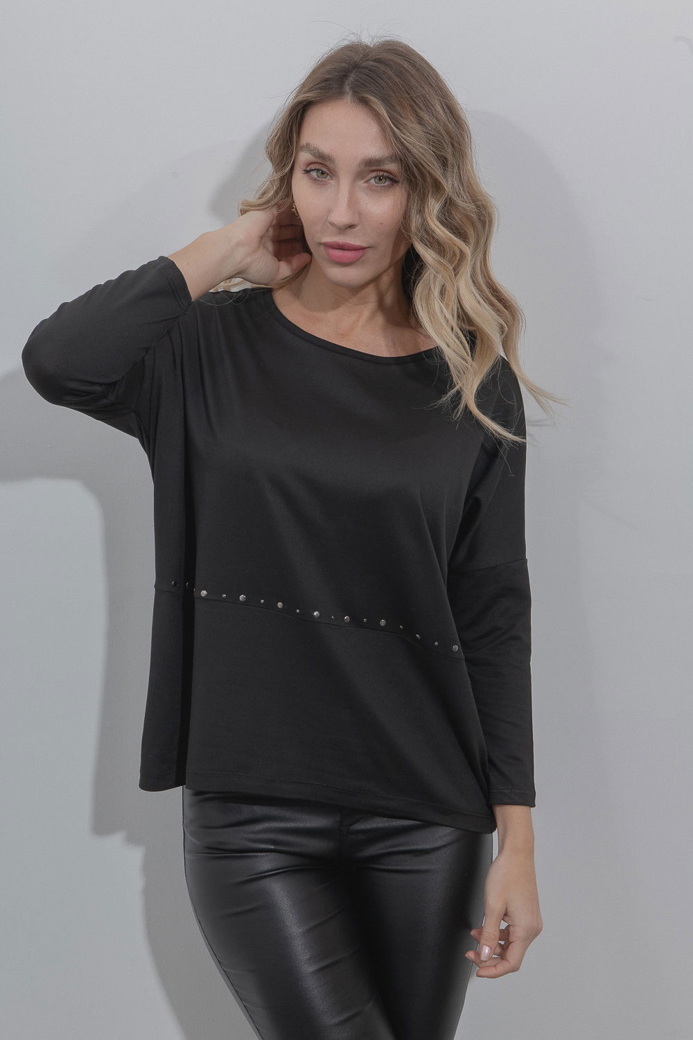 Remera manga larga, recorte en bajo con aplique de tachas hotfix