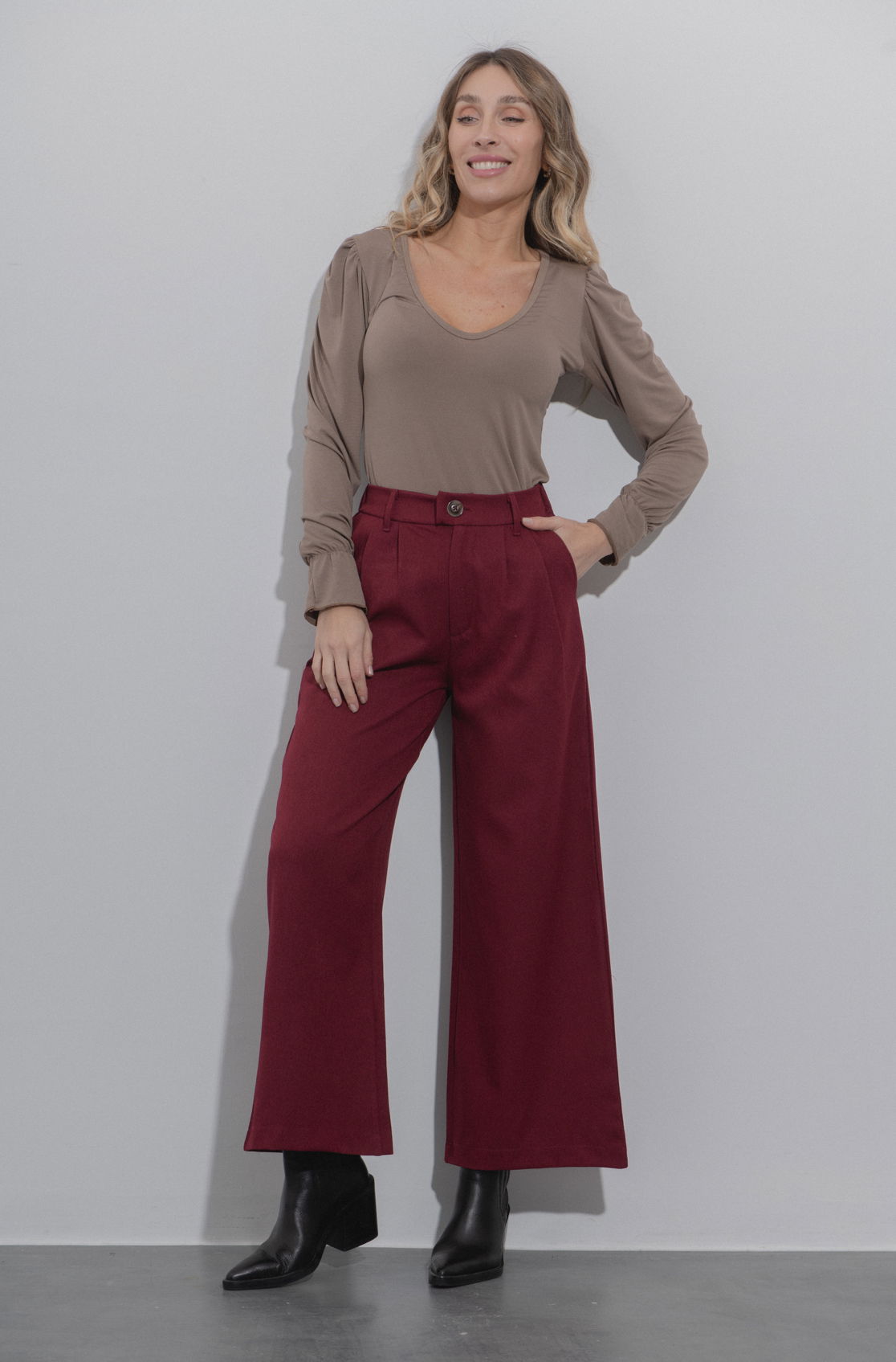 Pantalón palazo sastrero, bolsillos ojal en espalda, botón y cierre en delantero