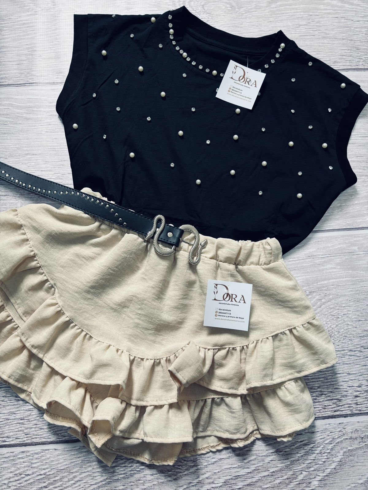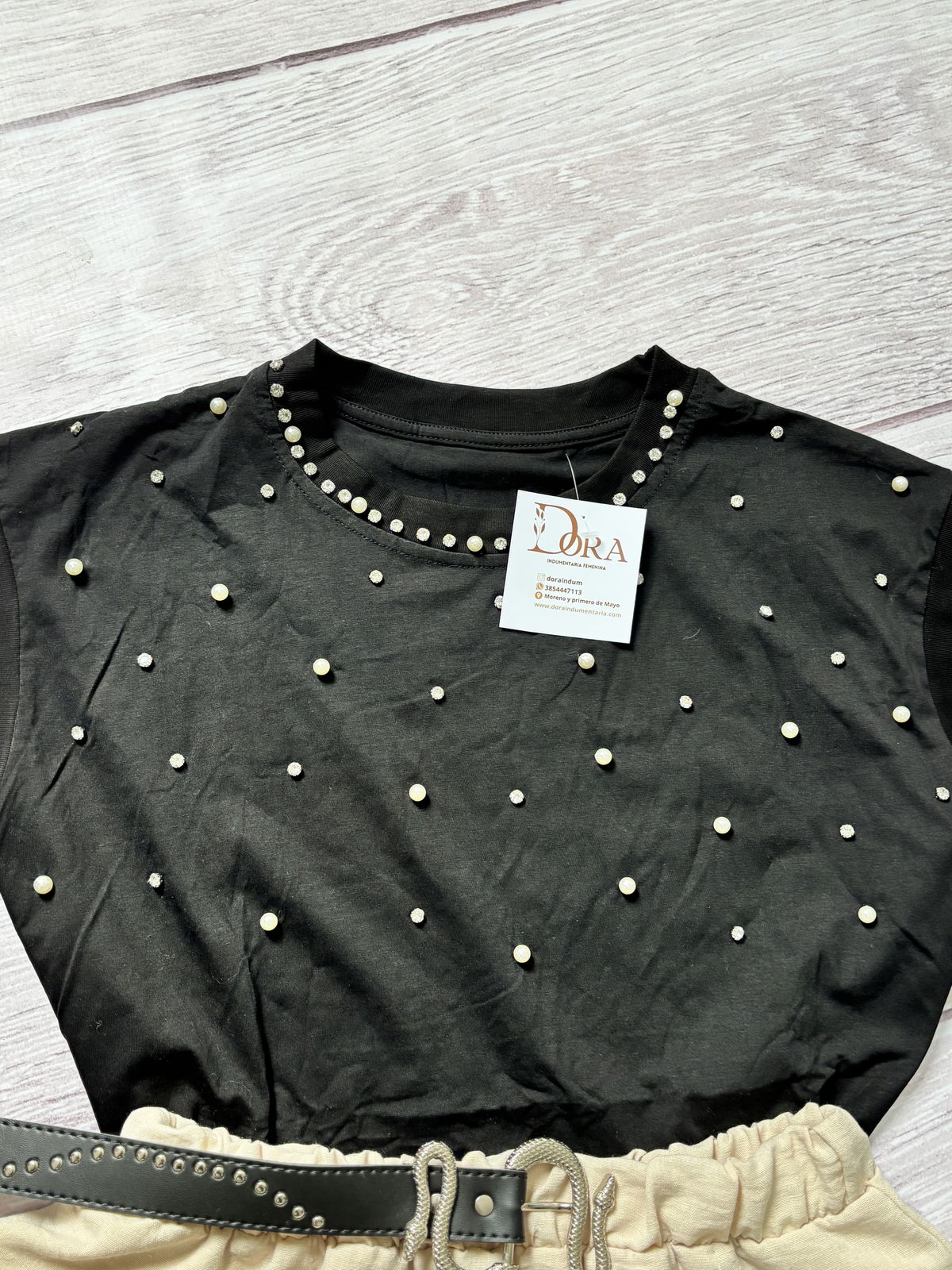 Esta remera negra se distingue por sus delicadas perlas bordadas y toques de piedrería brillante que iluminan el diseño, aportando sofisticación y glamour.
