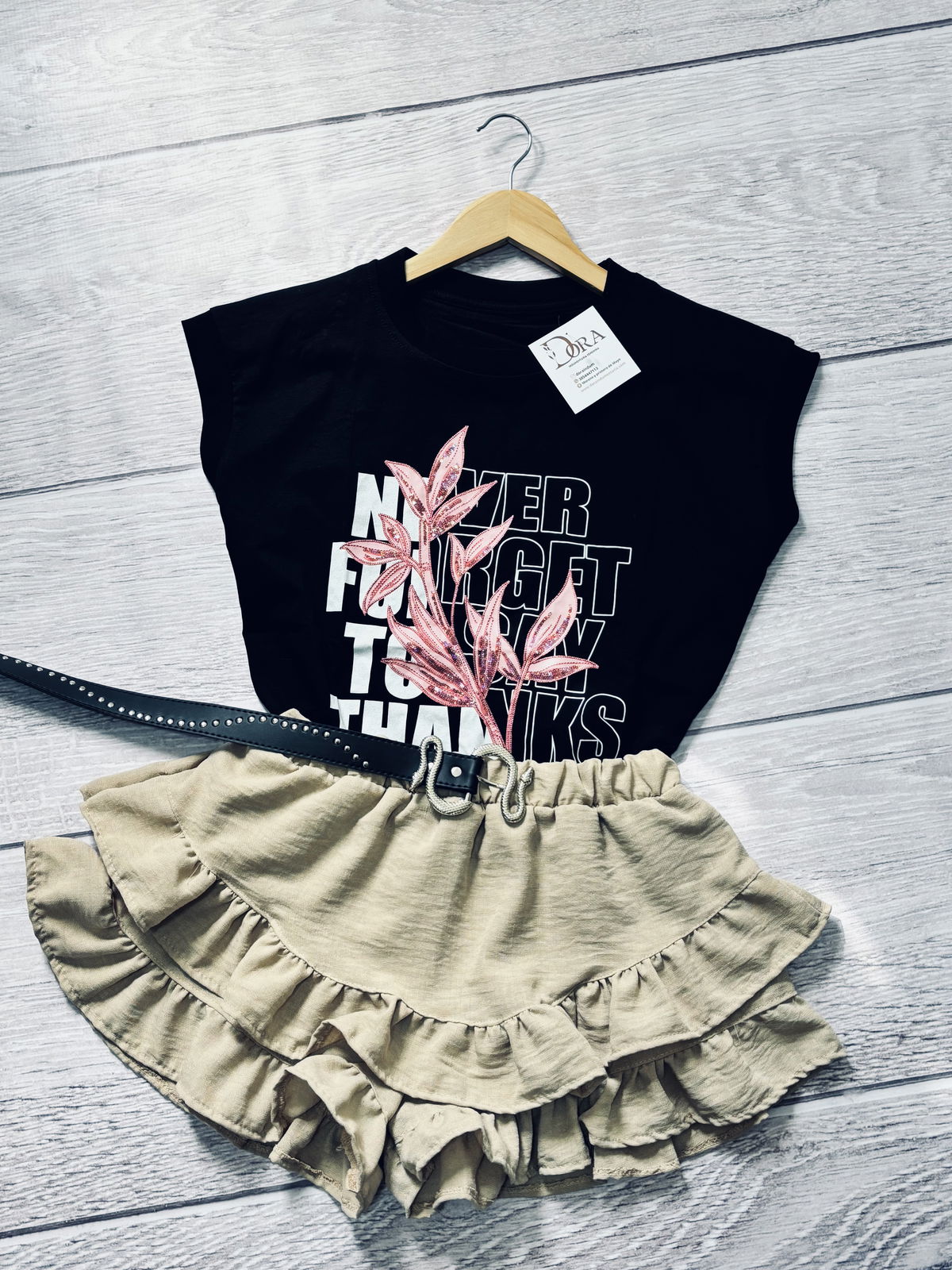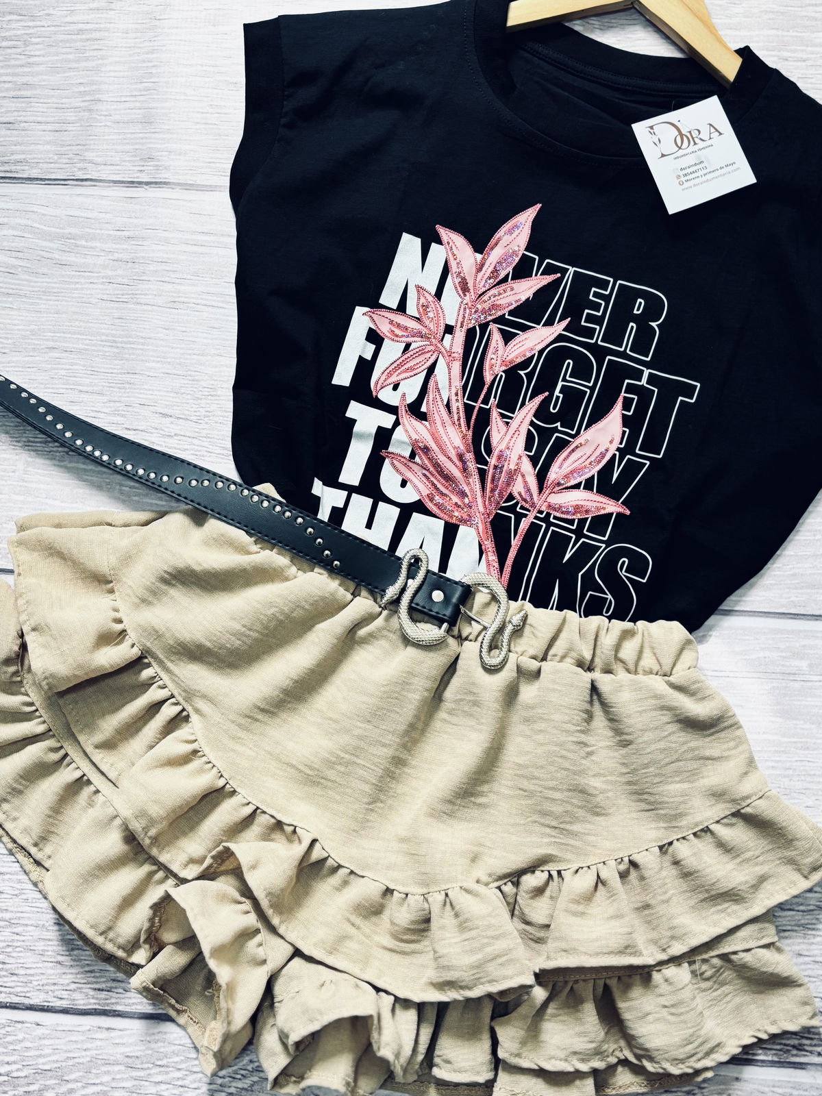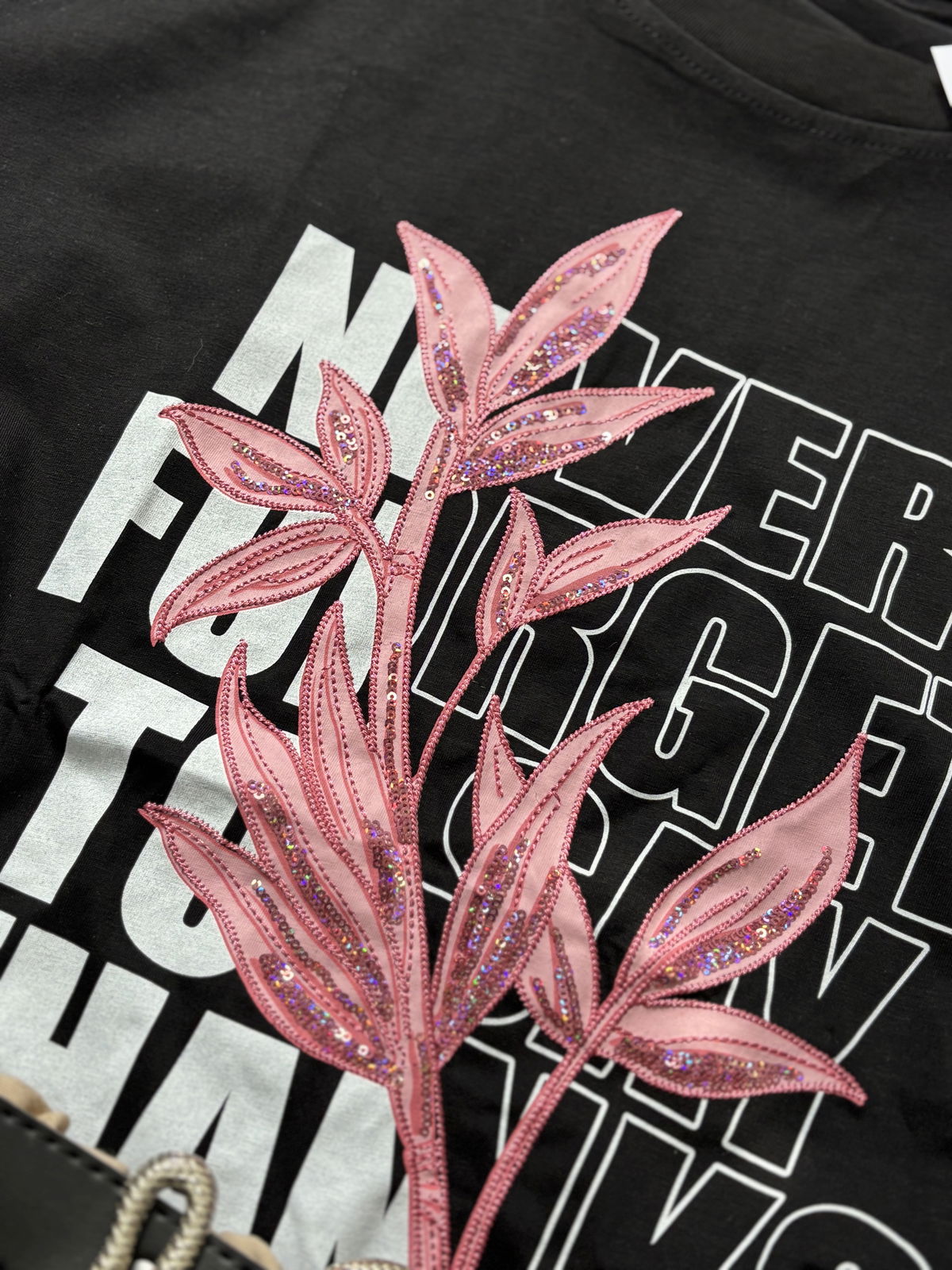 Esta remera negra destaca por su diseño exclusivo bordado con lentejuelas en tonos rosados, que crean un contraste moderno y femenino.