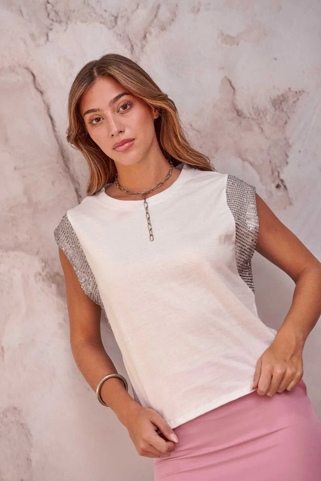 Remera de algodón con mangas japonesas de lentejuelas